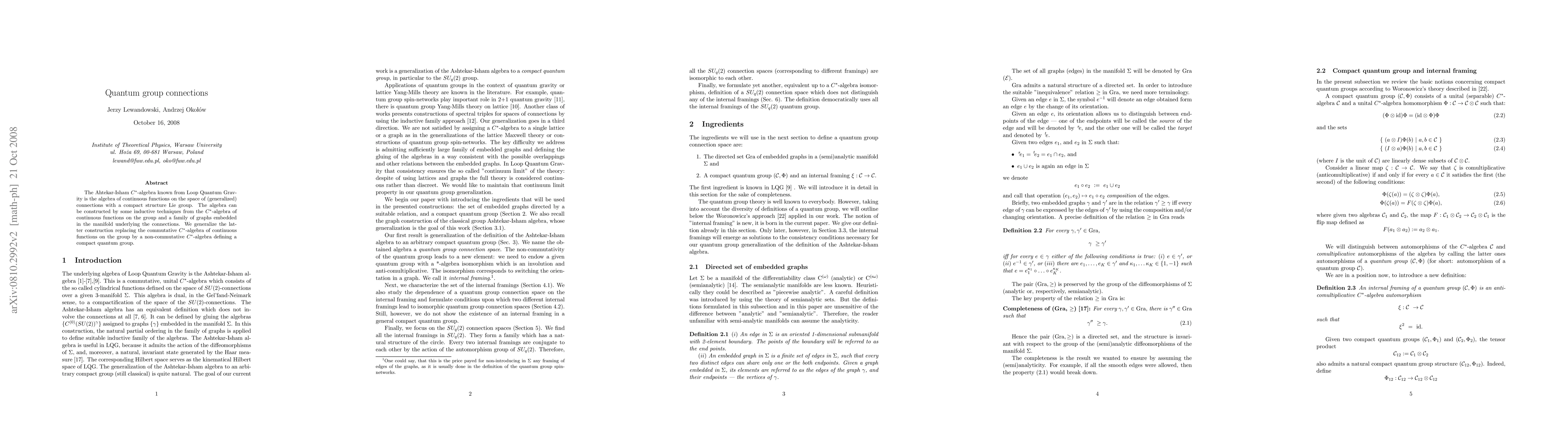 The paper introduces a method for constructing quantum group connection spaces using compact quantum groups and establishes an isomorphism with a natural SUq(2) connection space, providing a novel framework for quantum gravity research.