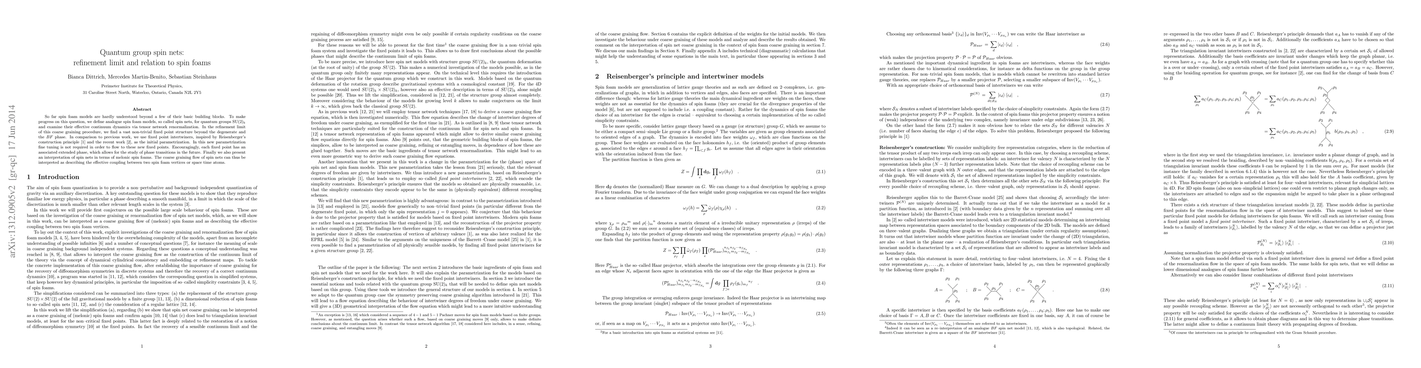 So far spin foam models are hardly understood beyond a few of their basic building blocks. To make progress on this question, we define analogue spin foam models, so called spin nets, for quantum groups $\text{SU}(2)_k$ and examine their effective continuum dynamics via tensor network renormalization. In the refinement limit of this coarse graining procedure, we find a vast non-trivial fixed point structure beyond the degenerate and the $BF$ phase. In comparison to previous work, we use fixed point intertwiners, inspired by Reisenberger's construction principle [1] and the recent work [2], as the initial parametrization. In this new parametrization fine tuning is not required in order to flow to these new fixed points. Encouragingly, each fixed point has an associated extended phase, which allows for the study of phase transitions in the future. Finally we also present an interpretation of spin nets in terms of melonic spin foams. The coarse graining flow of spin nets can thus be interpreted as describing the effective coupling between two spin foam vertices or space time atoms.