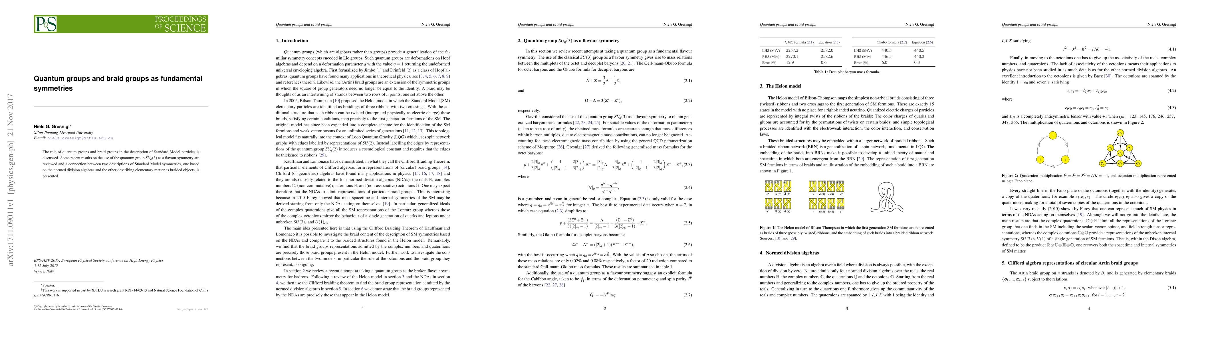 The role of quantum groups and braid groups in the description of Standard Model particles is discussed. Some recent results on the use of the quantum group $SU_q(3)$ as a flavour symmetry are reviewed and a connection between two descriptions of Standard Model symmetries, one based on the normed division algebras and the other describing elementary matter as braided objects, is presented.