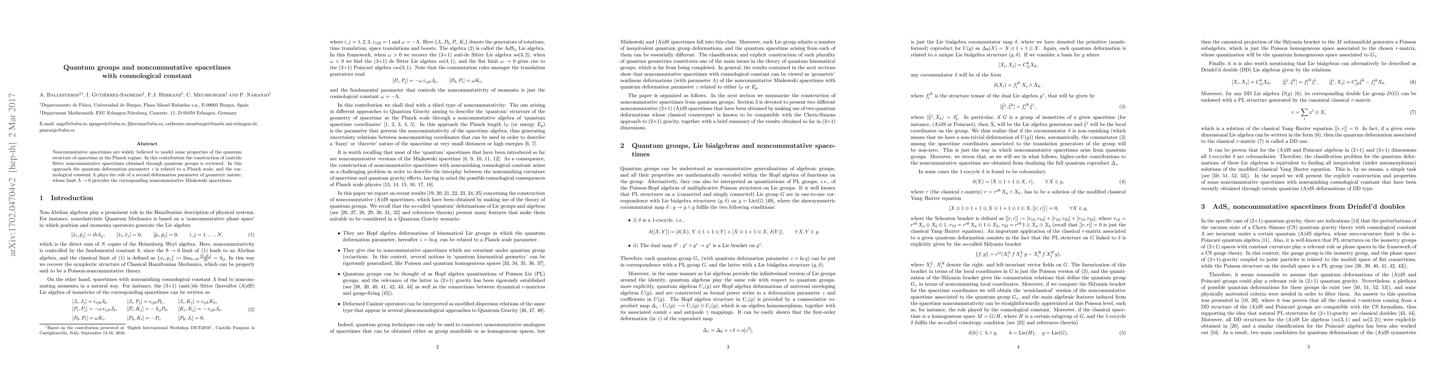 This paper reviews the construction of (anti-)de Sitter noncommutative spacetimes using quantum groups, where the deformation parameter $z$ relates to the Planck scale and the cosmological constant $\Lambda$ acts as a secondary geometric deformation parameter, with $\Lambda\to 0$ yielding noncommutative Minkowski spacetimes.
