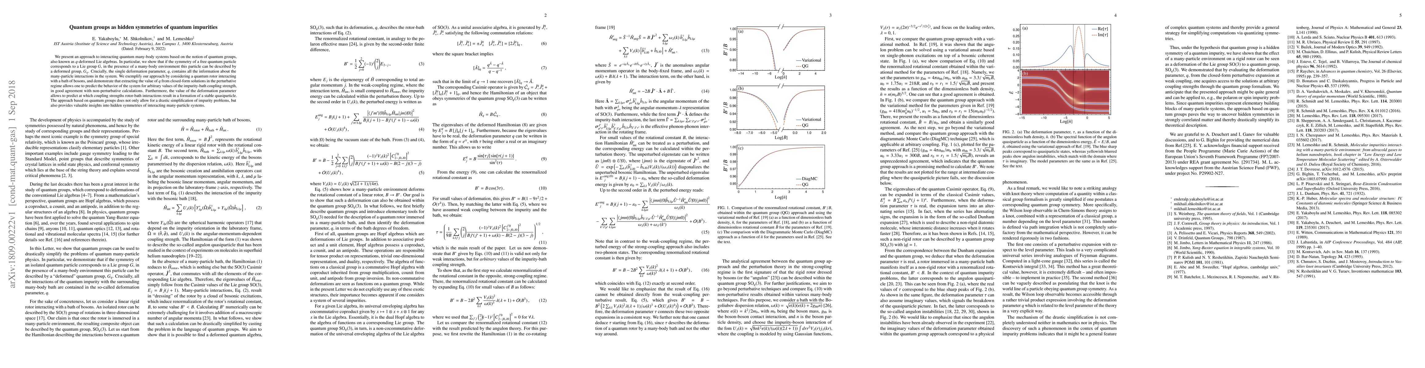 We present an approach to interacting quantum many-body systems based on the notion of quantum groups, also known as $q$-deformed Lie algebras. In particular, we show that if the symmetry of a free quantum particle corresponds to a Lie group $G$, in the presence of a many-body environment this particle can be described by a deformed group, $G_q$. Crucially, the single deformation parameter, $q$, contains all the information about the many-particle interactions in the system. We exemplify our approach by considering a quantum rotor interacting with a bath of bosons, and demonstrate that extracting the value of $q$ from closed-form solutions in the perturbative regime allows one to predict the behavior of the system for arbitrary values of the impurity-bath coupling strength, in good agreement with non-perturbative calculations. Furthermore, the value of the deformation parameter allows to predict at which coupling strengths rotor-bath interactions result in a formation of a stable quasiparticle. The approach based on quantum groups does not only allow for a drastic simplification of impurity problems, but also provides valuable insights into hidden symmetries of interacting many-particle systems.
