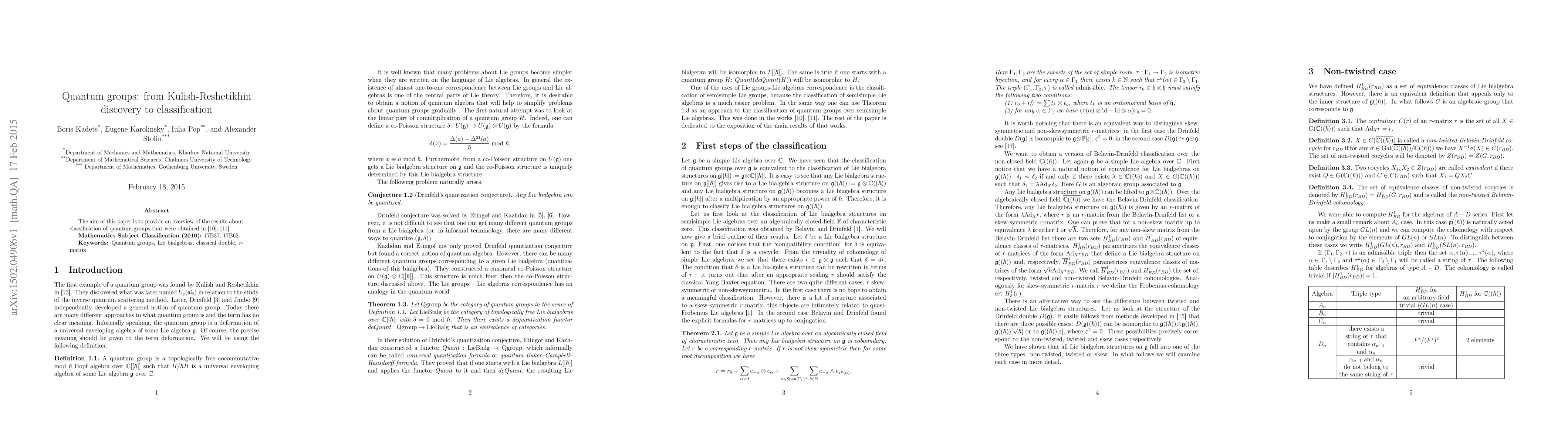 The aim of this paper is to provide an overview of the results about classification of quantum groups that were obtained in arXiv:1303.4046 [math.QA] and arXiv:1502.00403 [math.QA].
