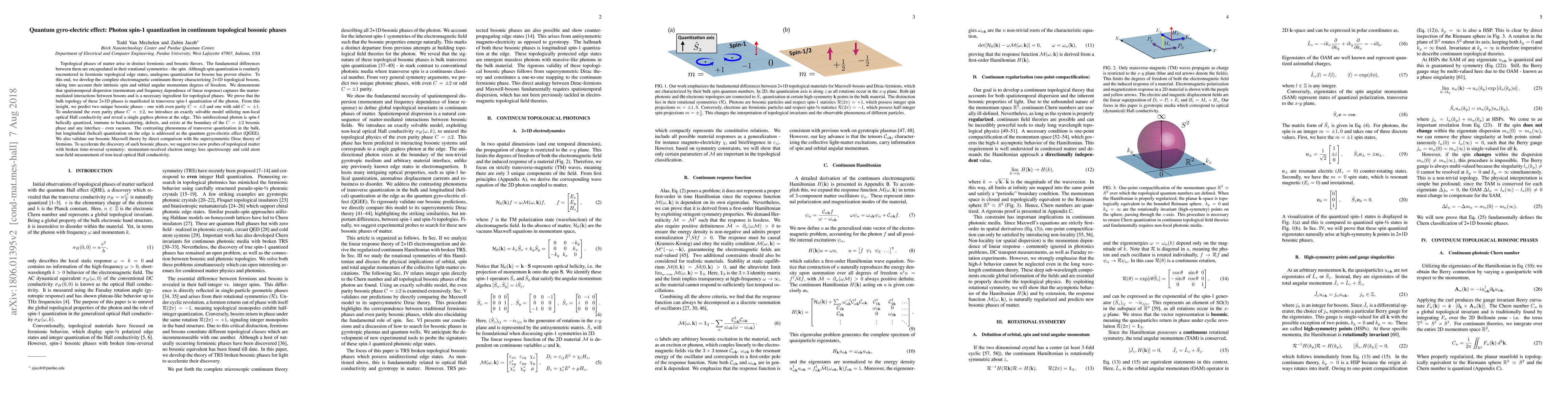 Topological phases of matter arise in distinct fermionic and bosonic flavors. The fundamental differences between them are encapsulated in their rotational symmetries - the spin. Although spin quantization is routinely encountered in fermionic topological edge states, analogous quantization for bosons has proven elusive. To this end, we develop the complete electromagnetic continuum theory characterizing 2+1D topological bosons, taking into account their intrinsic spin and orbital angular momentum degrees of freedom. We demonstrate that spatiotemporal dispersion (momentum and frequency dependence of linear response) captures the matter-mediated interactions between bosons and is a necessary ingredient for topological phases. We prove that the bulk topology of these 2+1D phases is manifested in transverse spin-1 quantization of the photon. From this insight, we predict two unique bosonic phases - one with even parity $C=\pm 2$ and one with odd $C=\pm 1$. To understand the even parity phase $C=\pm 2$, we introduce an exactly solvable model utilizing non-local optical Hall conductivity and reveal a single gapless photon at the edge. This unidirectional photon is spin-1 helically quantized, immune to backscattering, defects, and exists at the boundary of the $C=\pm 2$ bosonic phase and any interface - even vacuum. The contrasting phenomena of transverse quantization in the bulk, but longitudinal (helical) quantization on the edge is addressed as the quantum gyro-electric effect (QGEE). We also validate our bosonic Maxwell theory by direct comparison with the supersymmetric Dirac theory of fermions. To accelerate the discovery of such bosonic phases, we suggest two new probes of topological matter with broken time-reversal symmetry: momentum-resolved electron energy loss spectroscopy and cold atom near-field measurement of non-local optical Hall conductivity.