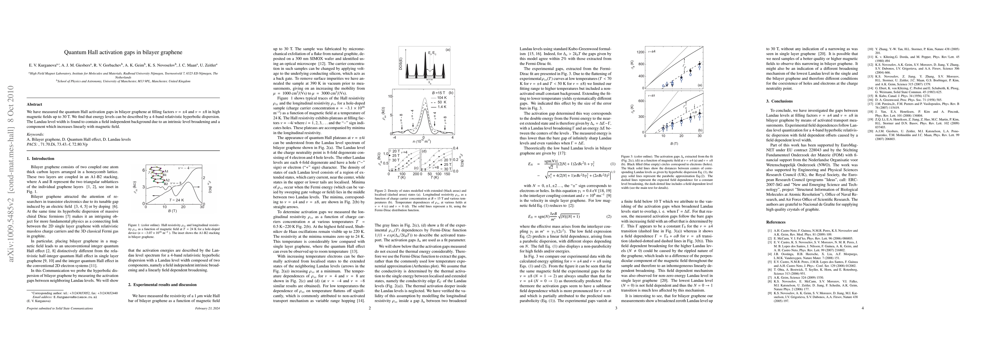 Researchers measured quantum Hall activation gaps in bilayer graphene at high magnetic fields, finding that energy levels can be described by a 4-band relativistic hyperbolic dispersion with varying Landau level widths.