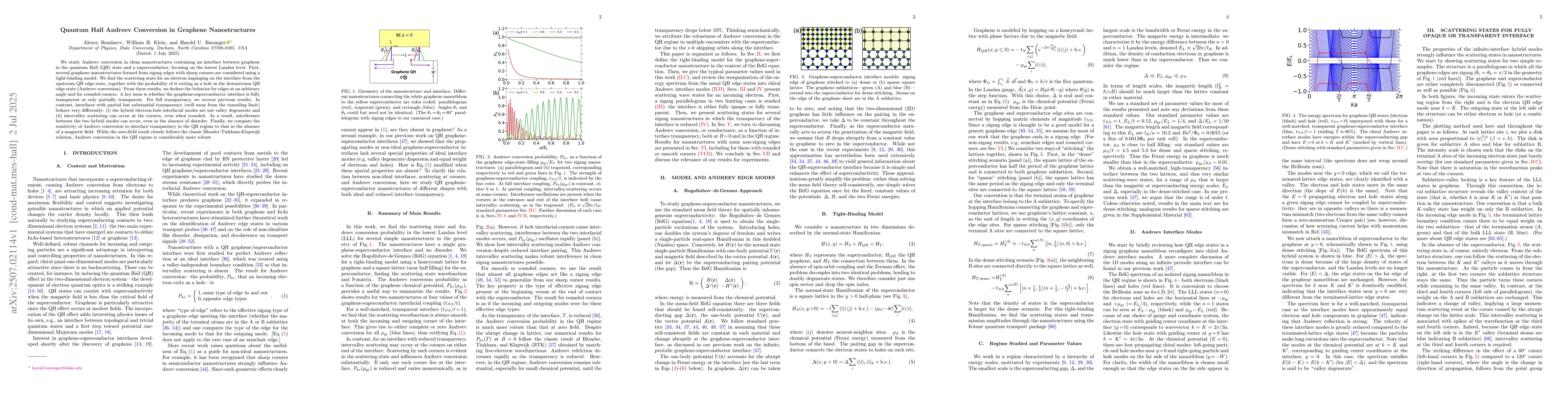 We study Andreev conversion in clean nanostructures containing an interface between graphene in the quantum Hall (QH) state and a superconductor, focusing on the lowest Landau level. First, several graphene nanostructures formed from zigzag edges with sharp corners are considered using a tight-binding model. We find the scattering state for an electron impinging on the interface from the upstream QH edge state, together with the probability of it exiting as a hole in the downstream QH edge state (Andreev conversion). From these results, we deduce the behavior for edges at an arbitrary angle and for rounded corners. A key issue is whether the graphene-superconductor interface is fully transparent or only partially transparent. For full transparency, we recover previous results. In contrast, interfaces with partial but substantial transparency (well away from the tunneling limit) behave very differently: (i) the hybrid electron-hole interfacial modes are not valley degenerate and (ii) intervalley scattering can occur at the corners, even when rounded. As a result, interference between the two hybrid modes can occur, even in the absence of disorder. Finally, we compare the sensitivity of Andreev conversion to interface transparency in the QH regime to that in the absence of a magnetic field. While the zero-field result closely follows the classic Blonder-Tinkham-Klapwijk relation, Andreev conversion in the QH regime is considerably more robust.