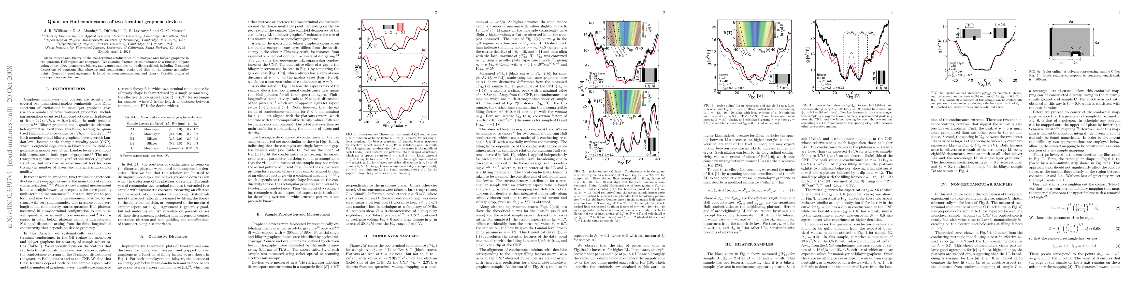 Measurement and theory of the two-terminal conductance of monolayer and bilayer graphene in the quantum Hall regime are compared. We examine features of conductance as a function of gate voltage that allow monolayer, bilayer, and gapped samples to be distinguished, including N-shaped distortions of quantum Hall plateaus and conductance peaks and dips at the charge neutrality point. Generally good agreement is found between measurement and theory. Possible origins of discrepancies are discussed.