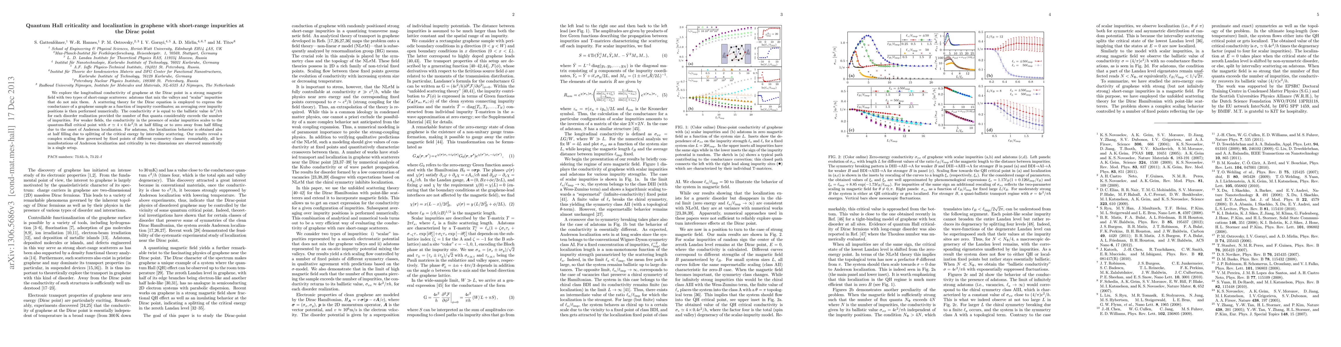 We explore the longitudinal conductivity of graphene at the Dirac point in a strong magnetic field with two types of short-range scatterers: adatoms that mix the valleys and "scalar" impurities that do not mix them. A scattering theory for the Dirac equation is employed to express the conductance of a graphene sample as a function of impurity coordinates; an averaging over impurity positions is then performed numerically. The conductivity $\sigma$ is equal to the ballistic value $4e^2/\pi h$ for each disorder realization provided the number of flux quanta considerably exceeds the number of impurities. For weaker fields, the conductivity in the presence of scalar impurities scales to the quantum-Hall critical point with $\sigma \simeq 4 \times 0.4 e^2/h$ at half filling or to zero away from half filling due to the onset of Anderson localization. For adatoms, the localization behavior is obtained also at half filling due to splitting of the critical energy by intervalley scattering. Our results reveal a complex scaling flow governed by fixed points of different symmetry classes: remarkably, all key manifestations of Anderson localization and criticality in two dimensions are observed numerically in a single setup.