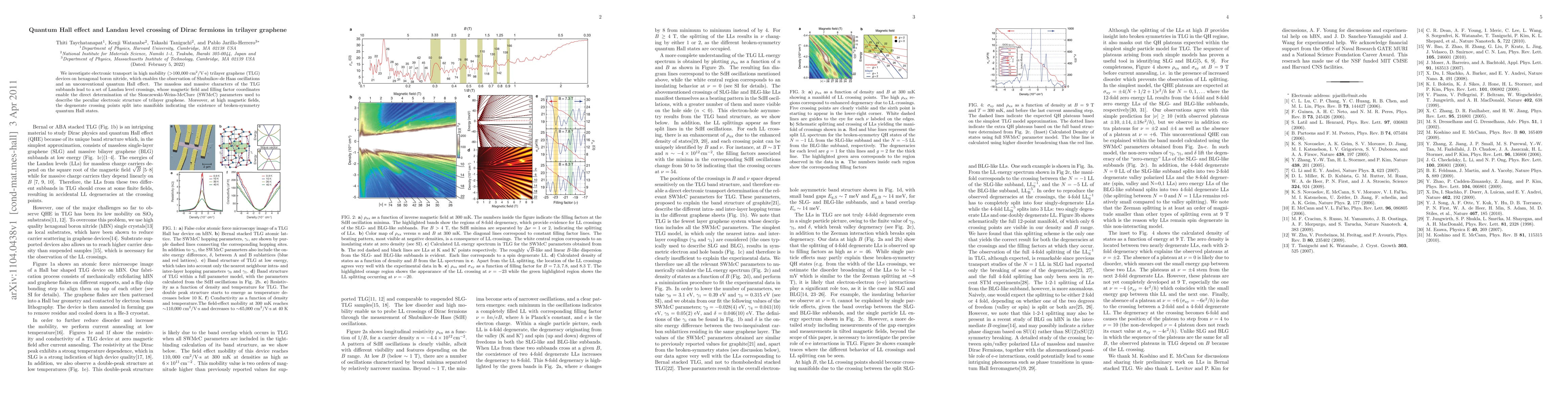 Summary: This paper examines electronic transport in high-mobility trilayer graphene devices, revealing Shubnikov-de Haas oscillations and an unconventional quantum Hall effect, with Landau level crossings providing insights into the electronic structure and the emergence of broken-symmetry quantum Hall states at high magnetic fields.