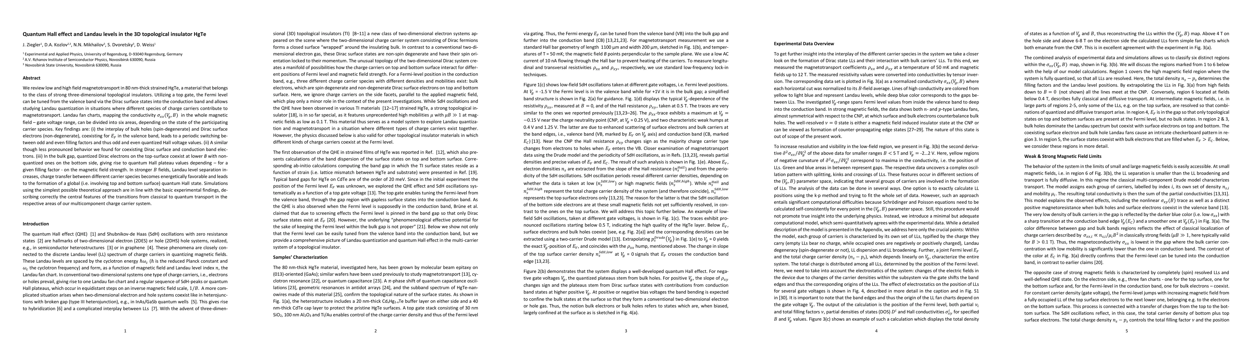 We review low and high field magnetotransport in 80 nm-thick strained HgTe, a material that belongs to the class of strong three-dimensional topological insulators. Utilizing a top gate, the Fermi level can be tuned from the valence band via the Dirac surface states into the conduction band and allows studying Landau quantization in situations where different species of charge carriers contribute to magnetotransport. Landau fan charts, mapping the conductivity $ \sigma_{xx}(V_g, B) $ in the whole magnetic field - gate voltage range, can be divided into six areas, depending on the state of the participating carrier species. Key findings are: (i) the interplay of bulk holes (spin-degenerate) and Dirac surface electrons (non-degenerate), coexisting for $ E_F $ in the valence band, leads to a periodic switching between odd and even filling factors and thus odd and even quantized Hall voltage values. (ii) A similar though less pronounced behavior we found for coexisting Dirac surface and conduction band electrons. (iii) In the bulk gap, quantized Dirac electrons on the top-surface coexist at lower B with non-quantized ones on the bottom side, giving rise to quantum Hall plateau values depending - for a given filling factor - on the magnetic field strength. In stronger $ B $ fields, Landau level separation increases, charge transfer between different carrier species becomes energetically favorable and leads to the formation of a global (i.e. involving top and bottom surface) quantum Hall state. Simulations using the simplest possible theoretical approach are in line with the basic experimental findings, describing correctly the central features of the transitions from classical to quantum transport in the respective areas of our multicomponent charge carrier system.