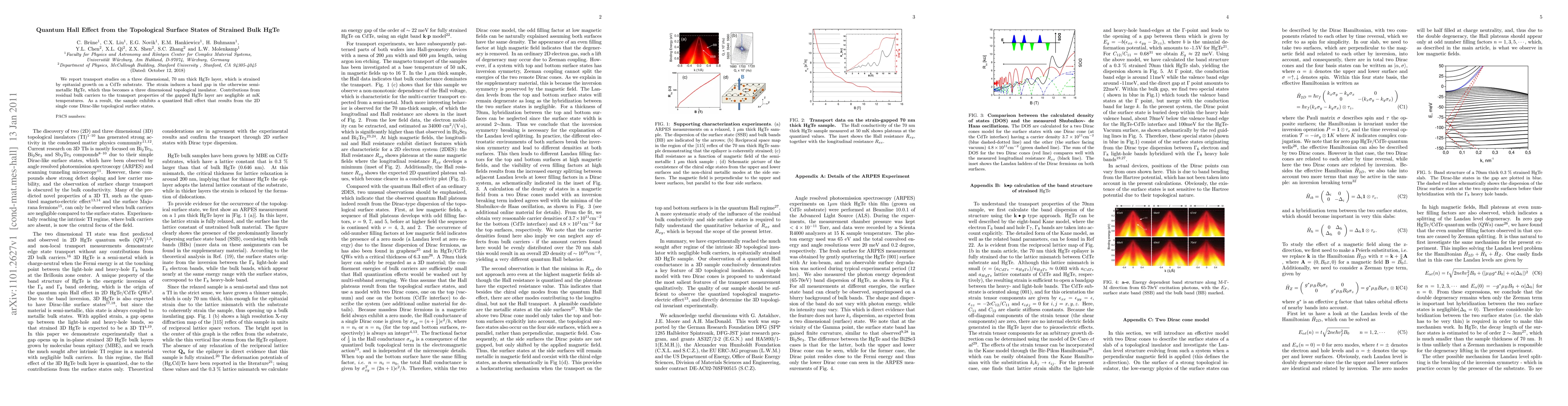 We report transport studies on a three dimensional, 70 nm thick HgTe layer, which is strained by epitaxial growth on a CdTe substrate. The strain induces a band gap in the otherwise semi-metallic HgTe, which thus becomes a three dimensional topological insulator. Contributions from residual bulk carriers to the transport properties of the gapped HgTe layer are negligible at mK temperatures. As a result, the sample exhibits a quantized Hall effect that results from the 2D single cone Dirac-like topological surface states.