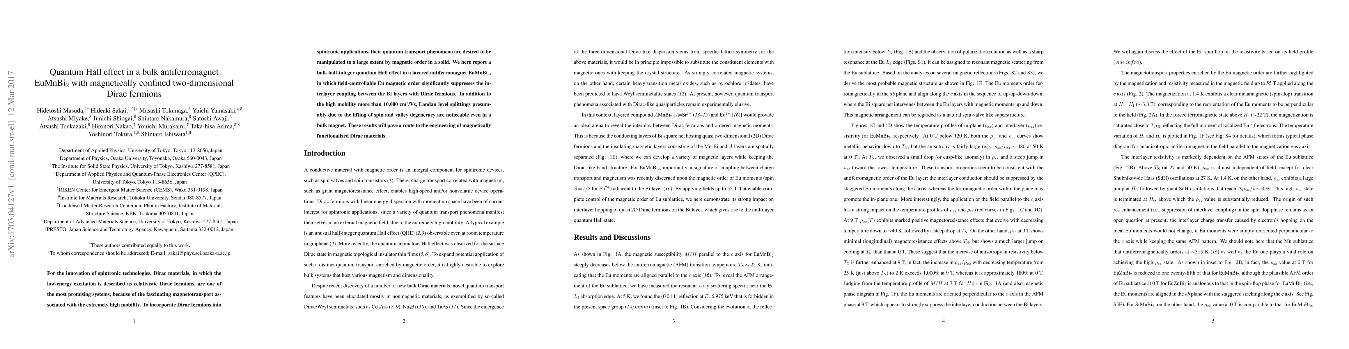 The research demonstrates a bulk half-integer quantum Hall effect in the antiferromagnet EuMnBi$_2$, where magnetically confined two-dimensional Dirac fermions exhibit high mobility and Landau level splittings. This discovery suggests potential for engineering magnetically functionalized Dirac materials for spintronic applications.
