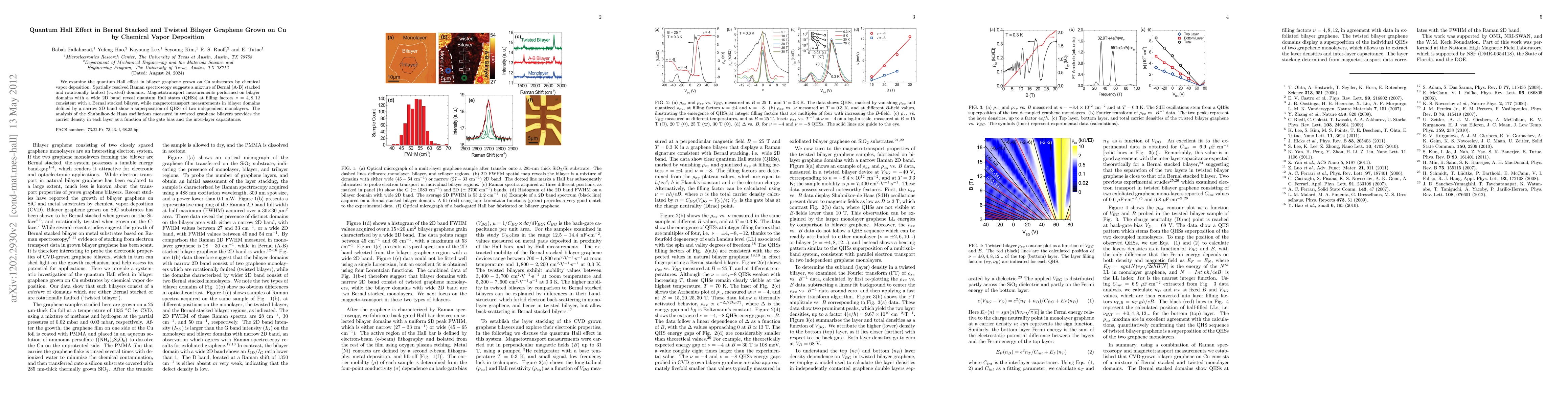 This study investigates the quantum Hall effect in bilayer graphene grown on Cu via chemical vapor deposition, revealing both Bernal stacked and twisted domains. Quantum Hall states at filling factors ν=4, 8, 12 are observed in Bernal stacked regions, while twisted regions show behavior akin to two independent monolayers, with detailed analysis of carrier density and inter-layer capacitance via Shubnikov-de Haas oscillations.