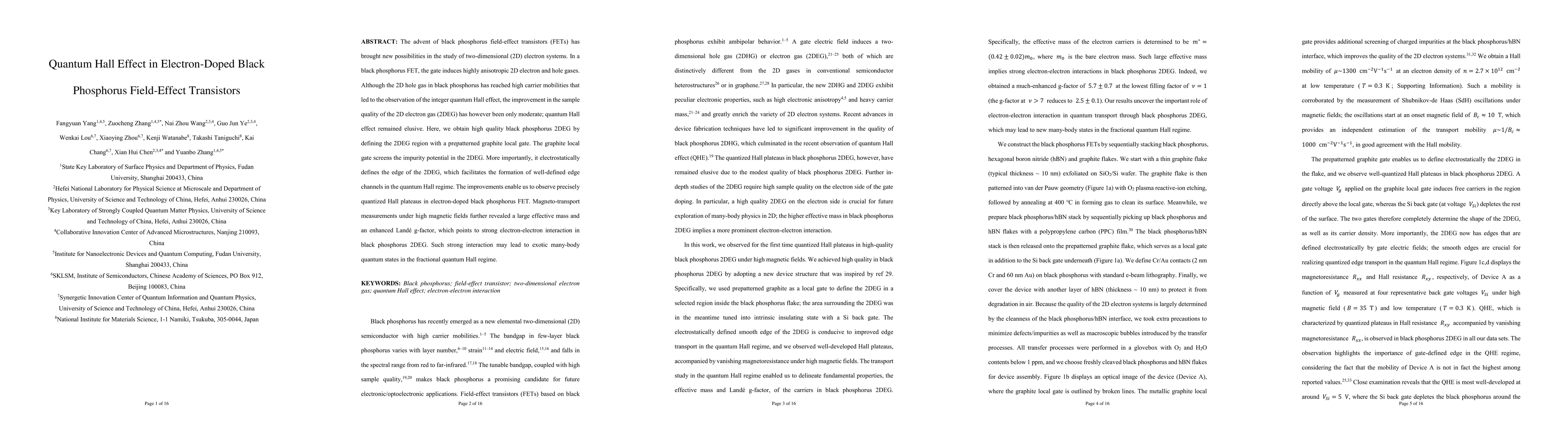 This study successfully observes the quantum Hall effect in electron-doped black phosphorus field-effect transistors by utilizing a prepatterned graphite local gate to improve the quality of the 2D electron gas. The findings reveal strong electron-electron interactions, suggesting potential for exotic quantum states.