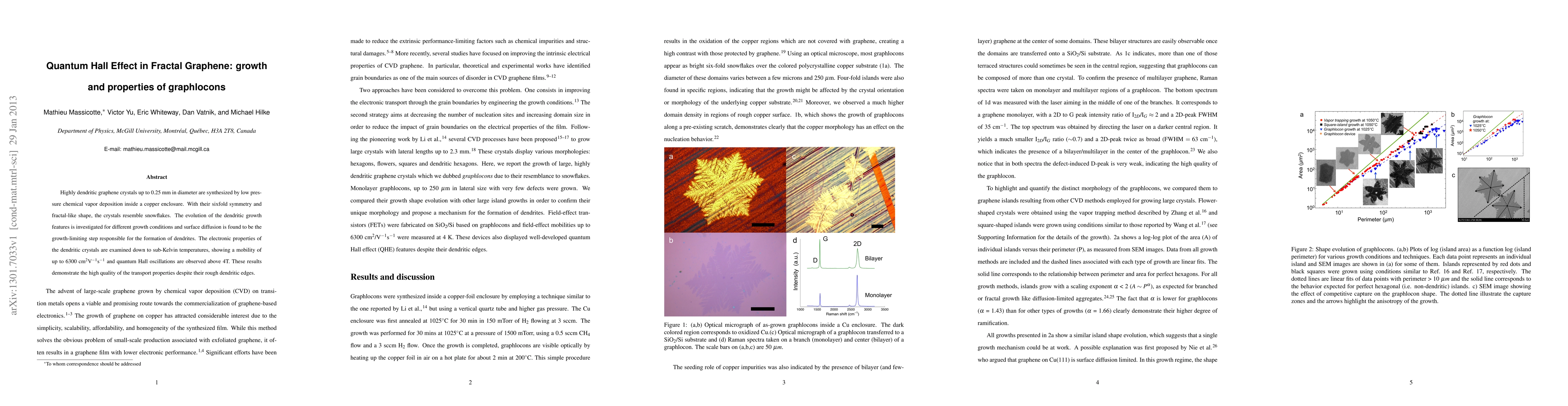 Highly dendritic graphene crystals up to 0.25 mm in diameter are synthesized by low pressure chemical vapor deposition inside a copper enclosure. With their sixfold symmetry and fractal-like shape, the crystals resemble snowflakes. The evolution of the dendritic growth features is investigated for different growth conditions and surface diffusion is found to be the growth-limiting step responsible for the formation of dendrites. The electronic properties of the dendritic crystals are examined down to sub-Kelvin temperatures, showing a mobility of up to 6300 cm$^2$V$^{-1}$s$^{-1}$ and quantum Hall oscillations are observed above 4T. These results demonstrate the high quality of the transport properties despite their rough dendritic edges.