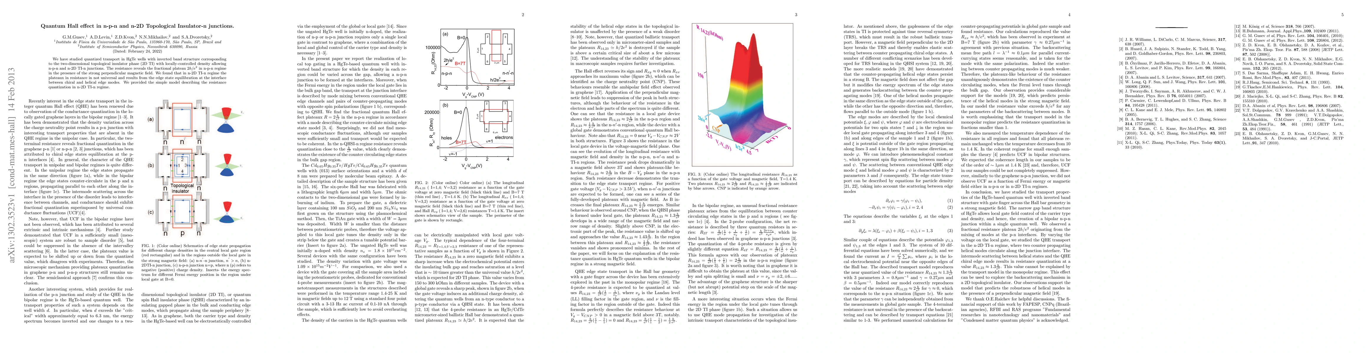This study investigates quantized transport in HgTe wells displaying a two-dimensional topological insulator phase, examining n-p-n and n-2D TI-n junctions. The research reveals fractional plateaus of resistance $2h/e^{2}$ in n-p-n junctions under strong magnetic fields, while n-2D TI-n junctions exhibit non-universal resistance plateaus due to edge state equilibration.
