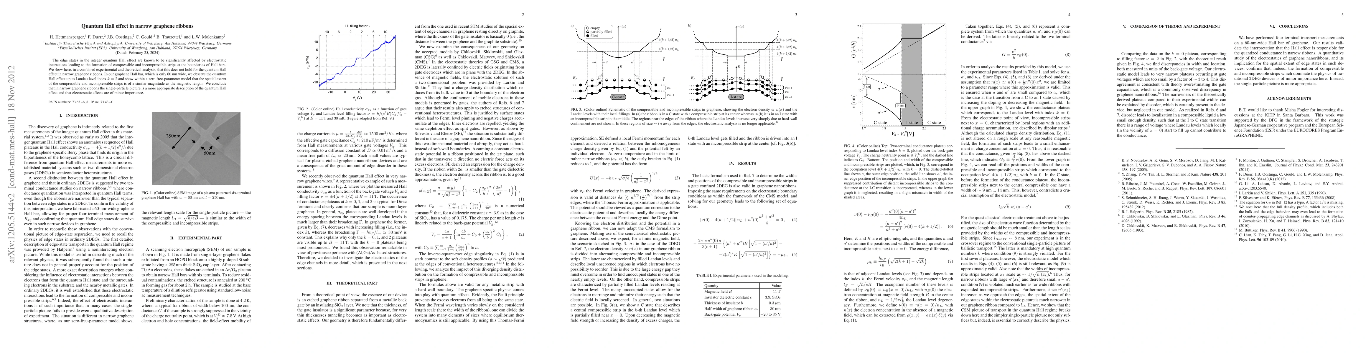 This study reveals that the quantum Hall effect in narrow graphene ribbons (60 nm wide) behaves differently from typical Hall bars, observing the effect up to Landau level index k=2. Contrary to expected electrostatic interactions, the single-particle picture effectively describes the phenomenon, indicating minor electrostatic effects in these ribbons.