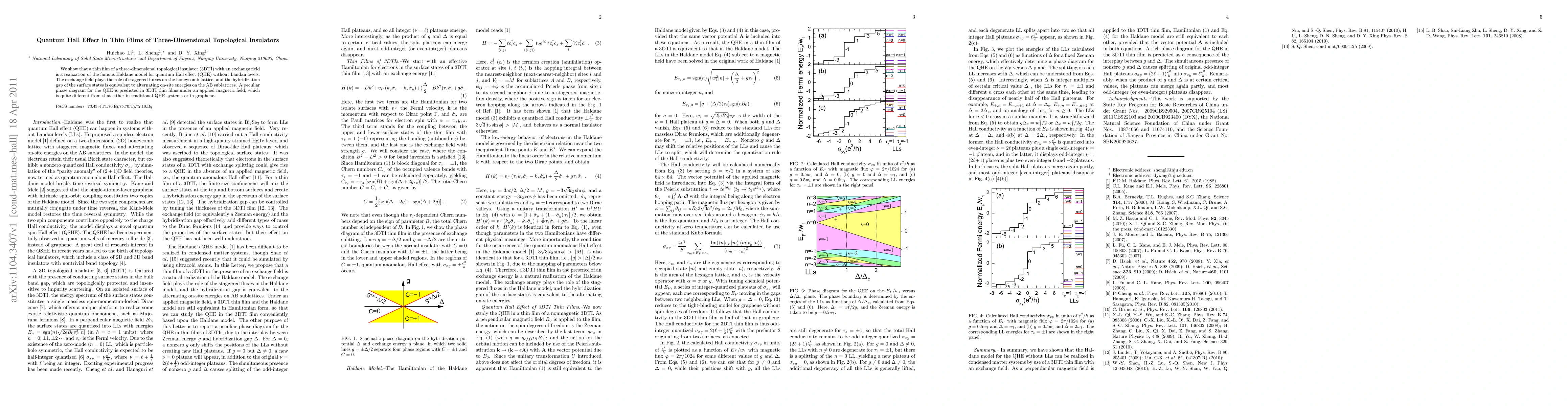 This paper demonstrates that thin films of three-dimensional topological insulators exhibit the quantum Hall effect (QHE) modeled by Haldane without Landau levels, driven by an exchange field simulating staggered fluxes. It predicts a unique phase diagram for QHE in these films under a magnetic field, differing from traditional QHE systems and graphene.