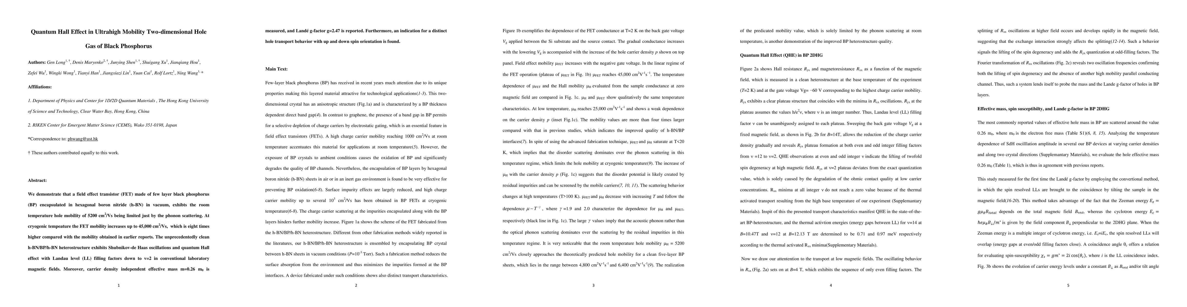 We demonstrate that a field effect transistor (FET) made of few layer black phosphorus (BP) encapsulated in hexagonal boron nitride (h-BN) in vacuum, exhibts the room temperature hole mobility of 5200 $cm^2/Vs$ being limited just by the phonon scattering. At cryogenic tempeature the FET mobility increases up to 45,000 $cm^2/Vs$, which is eight times higher compared with the mobility obtained in earlier reports. The unprecedentedly clean h-BN/BP/h-BN heterostructure exhibits Shubnikov-de Haas oscillations and quantum Hall effect with Landau level (LL) filling factors down to v=2 in conventional laboratory magnetic fields. Moreover, carrier density independent effective mass m=0.26 m_0 is measured, and Lande g-factor g=2.47 is reported. Furthermore, an indication for a distinct hole transport behavior with up and down spin orientation is found.