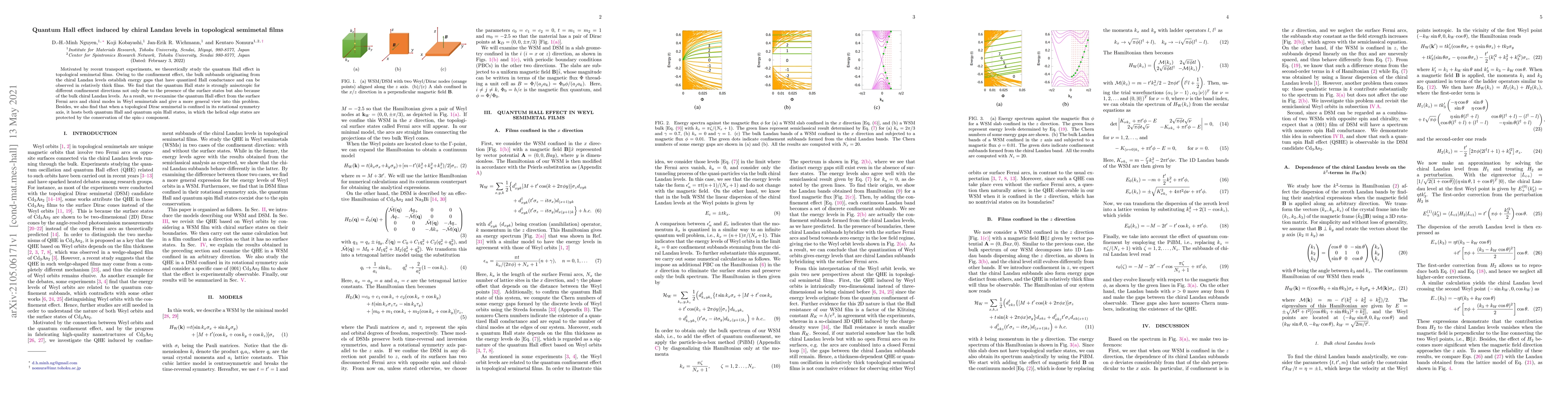 This paper investigates the quantum Hall effect in topological semimetal films, revealing that chiral Landau levels create quantized Hall conductance and anisotropic quantum Hall states due to surface states and bulk effects. It also finds that topological Dirac semimetals can exhibit both quantum Hall and quantum spin Hall states when confined along their rotational symmetry axis.