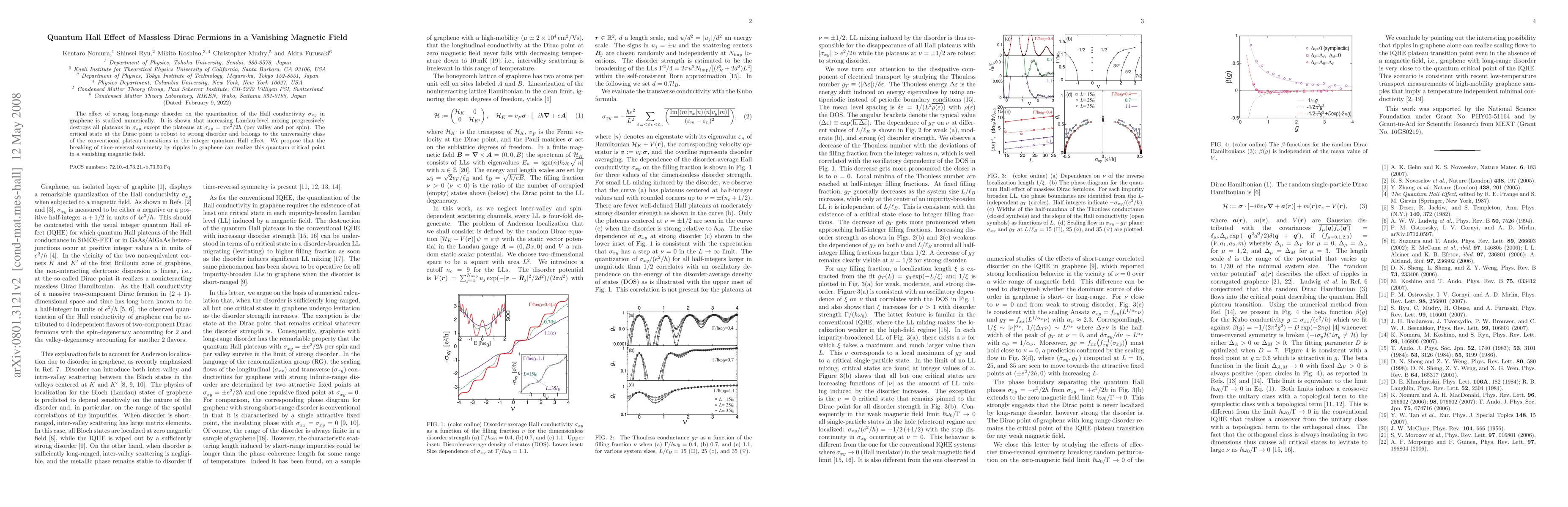 The paper proposes a theoretical framework for understanding the quantum Hall effect in graphene under strong long-range disorder, highlighting the role of time-reversal symmetry breaking by ripples in realizing a quantum critical point in a vanishing magnetic field.