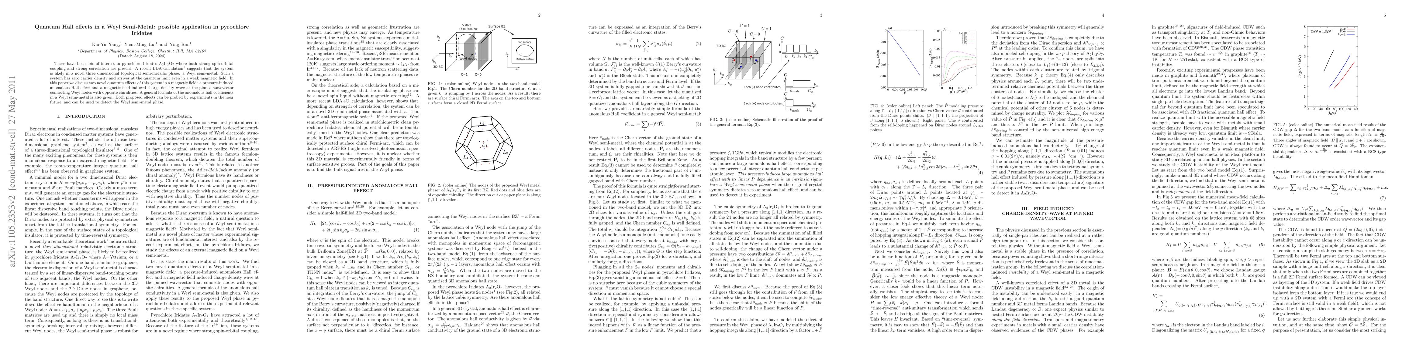 This paper explores quantum Hall effects in pyrochlore iridates, a Weyl semi-metal with strong spin-orbital coupling, identifying a pressure-induced anomalous Hall effect and a magnetic field-induced charge density wave. Proposed effects can serve as experimental probes to detect this novel topological semi-metallic phase.