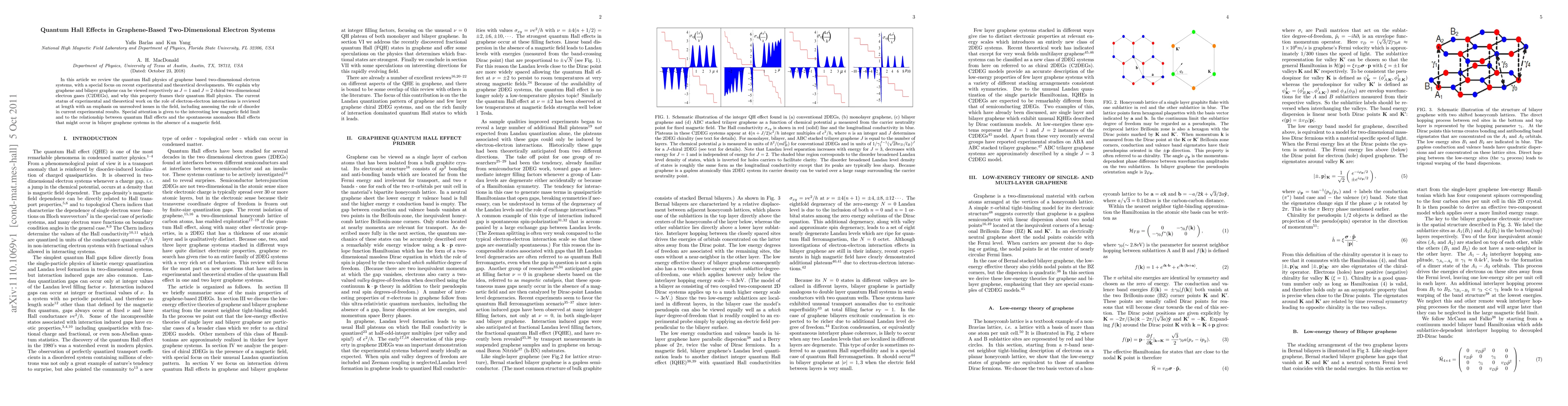 In this article we review the quantum Hall physics of graphene based two-dimensional electron systems, with a special focus on recent experimental and theoretical developments. We explain why graphene and bilayer graphene can be viewed respectively as J=1 and J=2 chiral two-dimensional electron gases (C2DEGs), and why this property frames their quantum Hall physics. The current status of experimental and theoretical work on the role of electron-electron interactions is reviewed at length with an emphasis on unresolved issues in the field, including assessing the role of disorder in current experimental results. Special attention is given to the interesting low magnetic field limit and to the relationship between quantum Hall effects and the spontaneous anomalous Hall effects that might occur in bilayer graphene systems in the absence of a magnetic field.