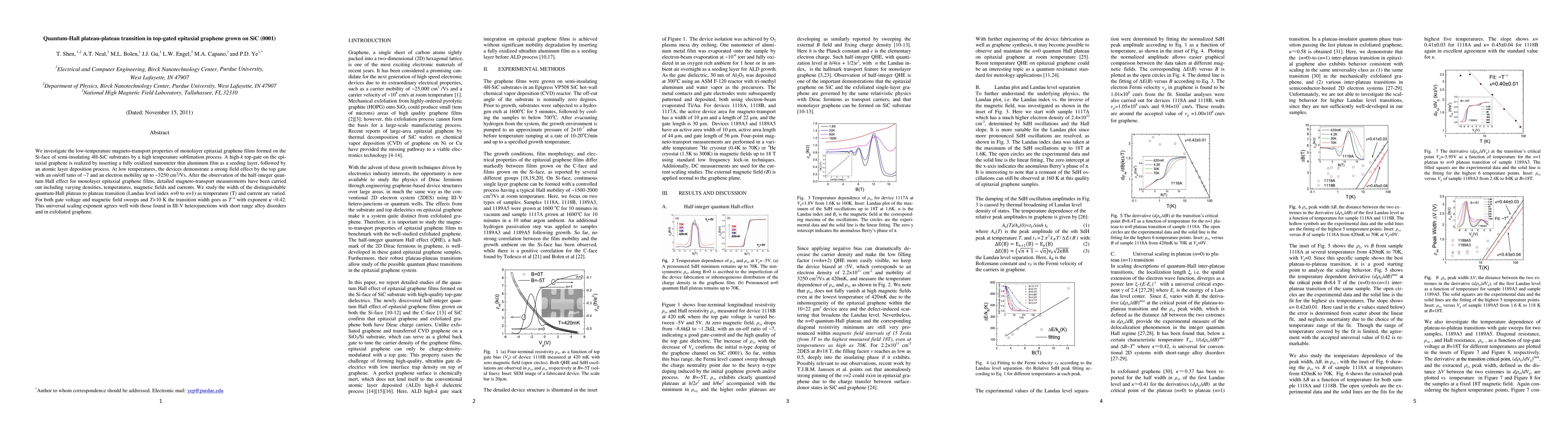 We investigate the low-temperature magneto-transport properties of monolayer epitaxial graphene films formed on the Si-face of semi-insulating 4H-SiC substrates by a high temperature sublimation process. A high-k top-gate on the epitaxial graphene is realized by inserting a fully oxidized nanometer thin aluminum film as a seeding layer, followed by an atomic layer deposition process. At low temperatures, the devices demonstrate a strong field effect by the top gate with an on/off ratio of ~7 and an electron mobility up to ~3250 cm^2/Vs. After the observation of the half-integer quantum Hall effect for monolayer epitaxial graphene films, detailed magneto-transport measurements have been carried out including varying densities, temperatures, magnetic fields and currents. We study the width of the distinguishable quantum-Hall plateau to plateau transition (Landau level index n=0 to n=1) as temperature (T) and current are varied. For both gate voltage and magnetic field sweeps and T>10 K the transition width goes as T^{-\kappa} with exponent \kappa ~0.42. This universal scaling exponent agrees well with those found in III-V heterojunctions with short range alloy disorders and in exfoliated graphene.