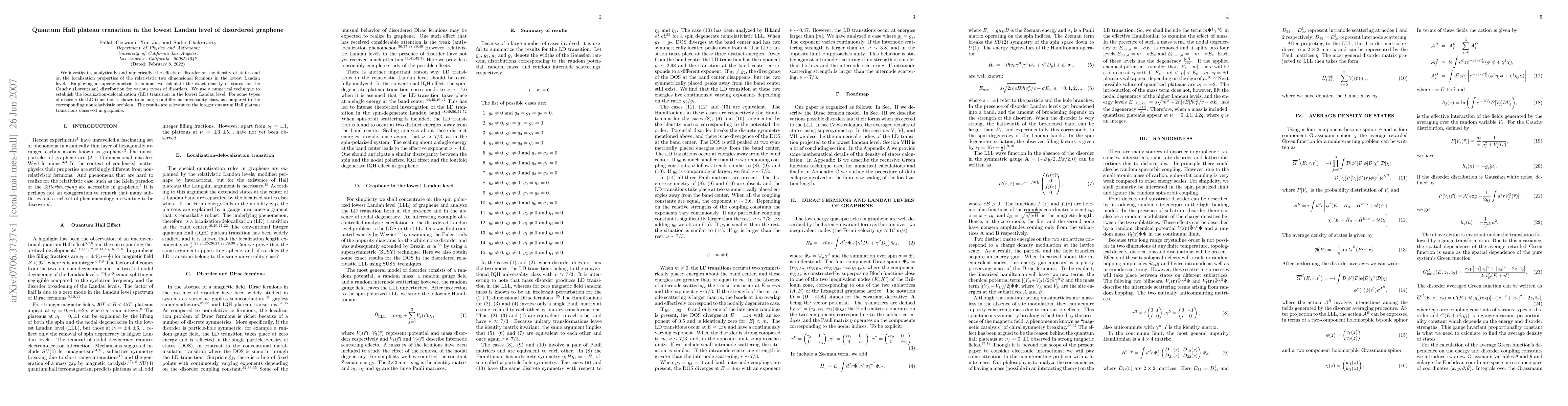 This paper investigates the quantum Hall plateau transition in disordered graphene, focusing on the lowest Landau level. Using supersymmetric techniques and numerical methods, it reveals distinct localization-delocalization transitions under different disorder types, showing some belong to a unique universality class compared to nonrelativistic systems.