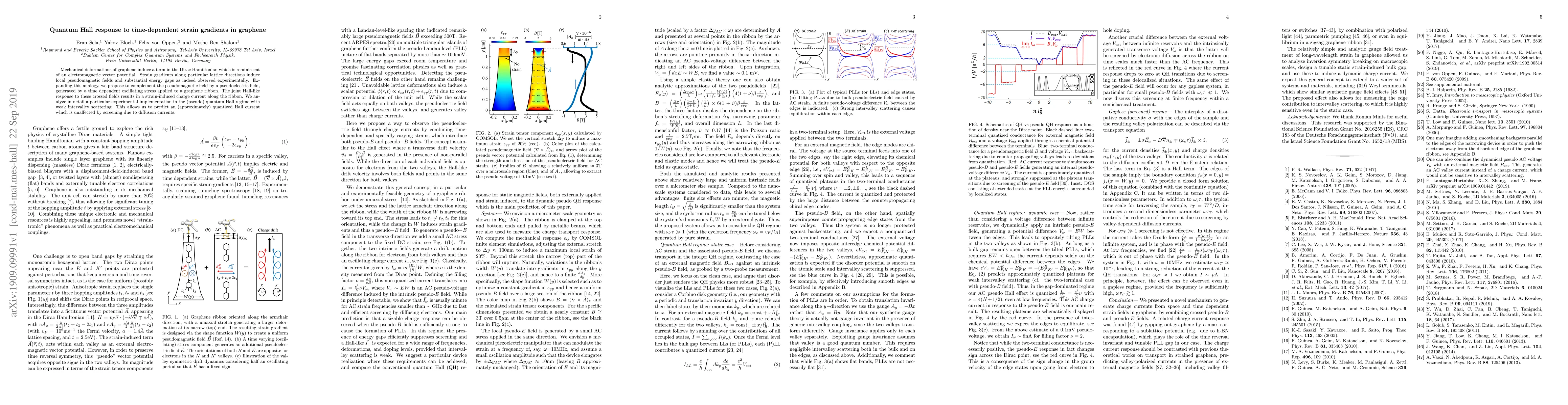 This paper investigates how mechanical strain gradients in graphene can induce pseudomagnetic fields, leading to substantial energy gaps. By applying time-dependent oscillating stress, it proposes a pseudoelectric field to generate a Hall-like response, predicting a quantized Hall current unaffected by diffusion currents in the quantum Hall regime.