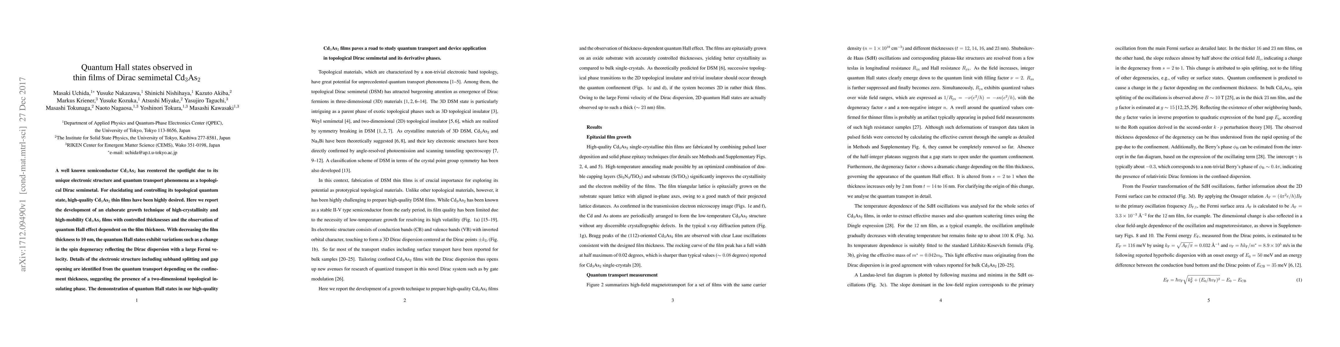 The paper reports the development of high-quality Cd3As2 thin films and the observation of quantum Hall states, showing variations in spin degeneracy and subband splitting that suggest a two-dimensional topological insulating phase, paving the way for quantum transport studies and device applications in topological Dirac semimetals.