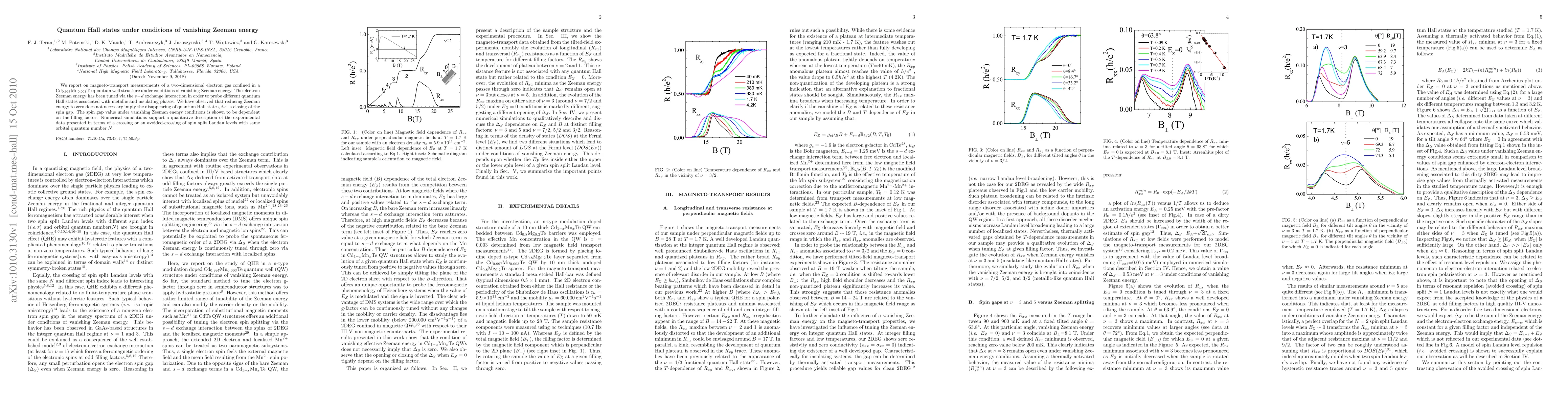 We report on magneto-transport measurements of a two-dimensional electron gas confined in a Cd$_{0.997}$Mn$_{0.003}$Te quantum well structure under conditions of vanishing Zeeman energy. The electron Zeeman energy has been tuned via the $s-d$ exchange interaction in order to probe different quantum Hall states associated with metallic and insulating phases. We have observed that reducing Zeeman energy to zero does not necessary imply the disappearing of quantum Hall states, i.e. a closing of the spin gap. The spin gap value under vanishing Zeeman energy conditions is shown to be dependent on the filling factor. Numerical simulations support a qualitative description of the experimental data presented in terms of a crossing or an avoided-crossing of spin split Landau levels with same orbital quantum number $N$.