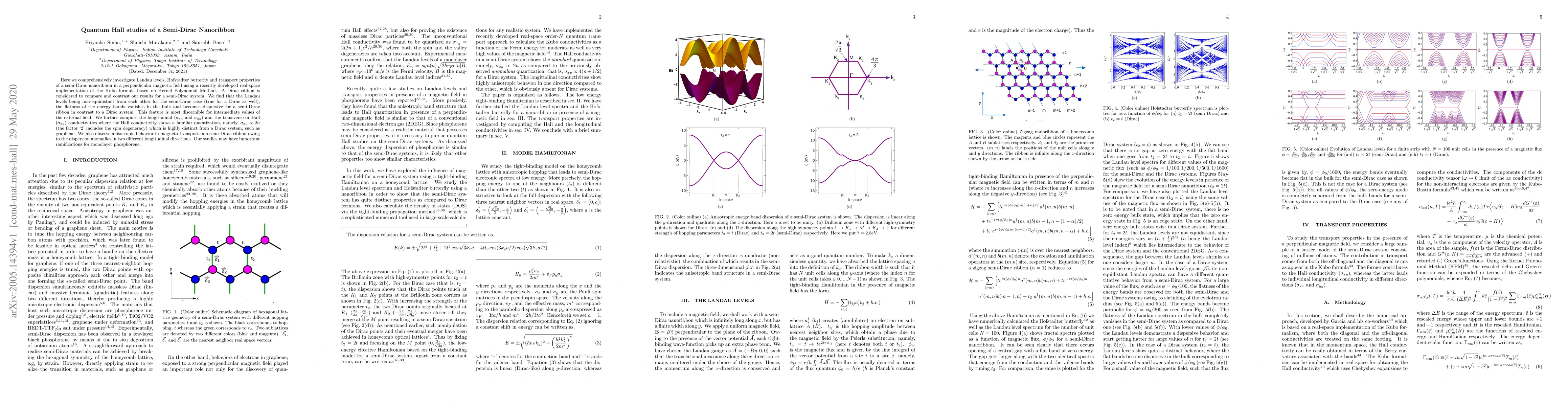 Researchers studied a semi-Dirac nanoribbon in a magnetic field, finding that its Landau levels and transport properties differ from those of a Dirac system, with unique features like anisotropic behavior and quantized Hall conductivity.