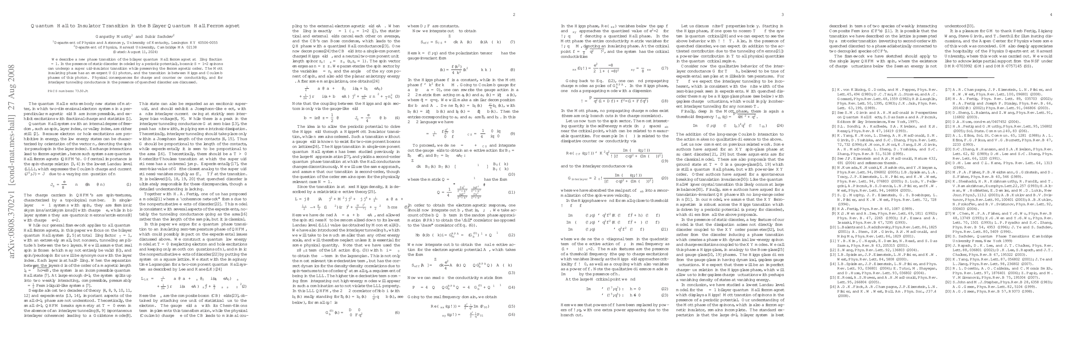 This paper investigates a phase transition in a bilayer quantum Hall ferromagnet at filling fraction $\nu = 1$, where spinons undergo a superfluid-insulator transition while maintaining ferromagnetic order. The transition involves a U(1) photon and shifts between Higgs and Coulomb phases, with implications for charge and counterflow conductivities and interlayer tunneling conductance.