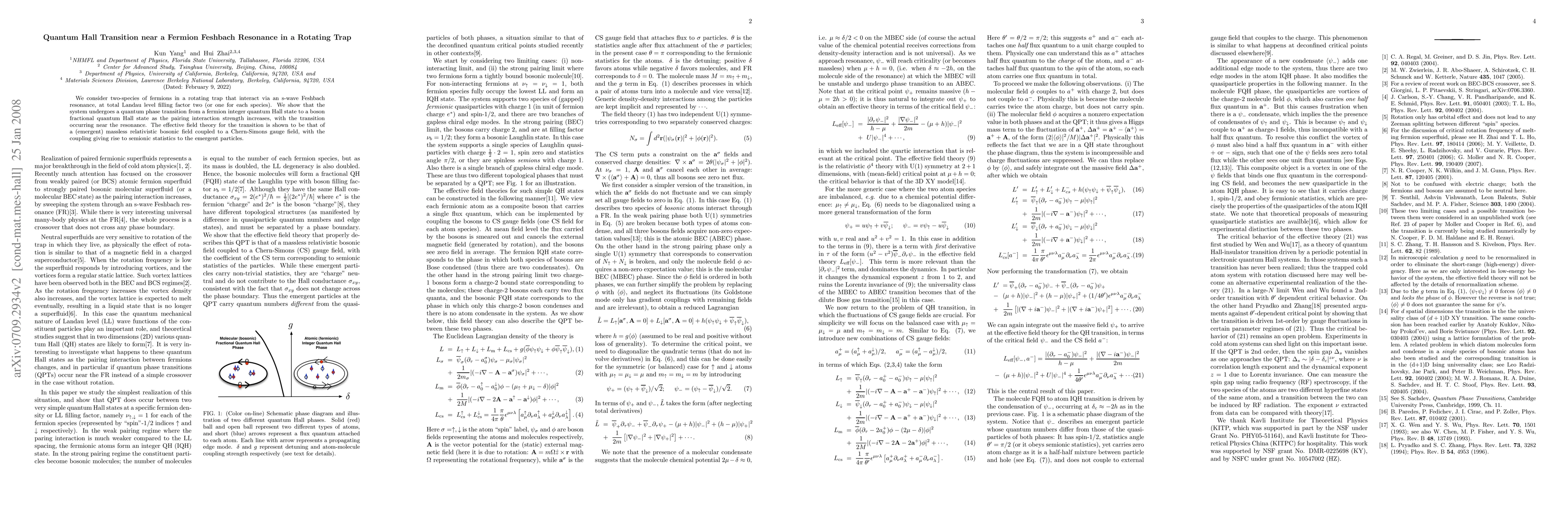 This paper investigates a quantum phase transition in a system of two-species fermions in a rotating trap interacting via an s-wave Feshbach resonance, showing the transition from an integer to a fractional quantum Hall state near the resonance. The transition is described by an effective field theory with emergent massless bosonic fields coupled to a Chern-Simons gauge field, exhibiting semionic statistics.