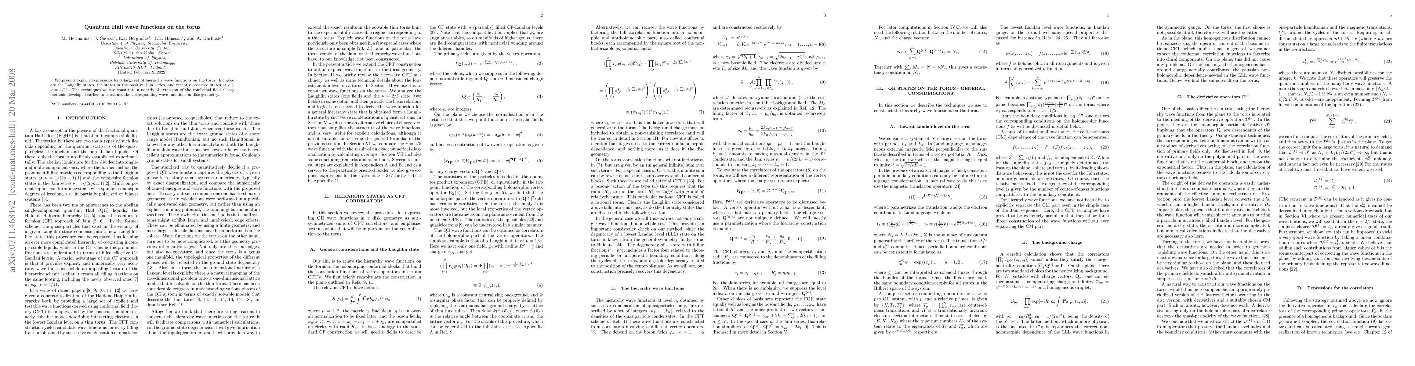 Researchers have developed explicit expressions for wave functions on a torus, covering various quantum Hall states including Laughlin states and recently observed states at nu = 4/11, expanding conformal field theory methods to disc geometry.