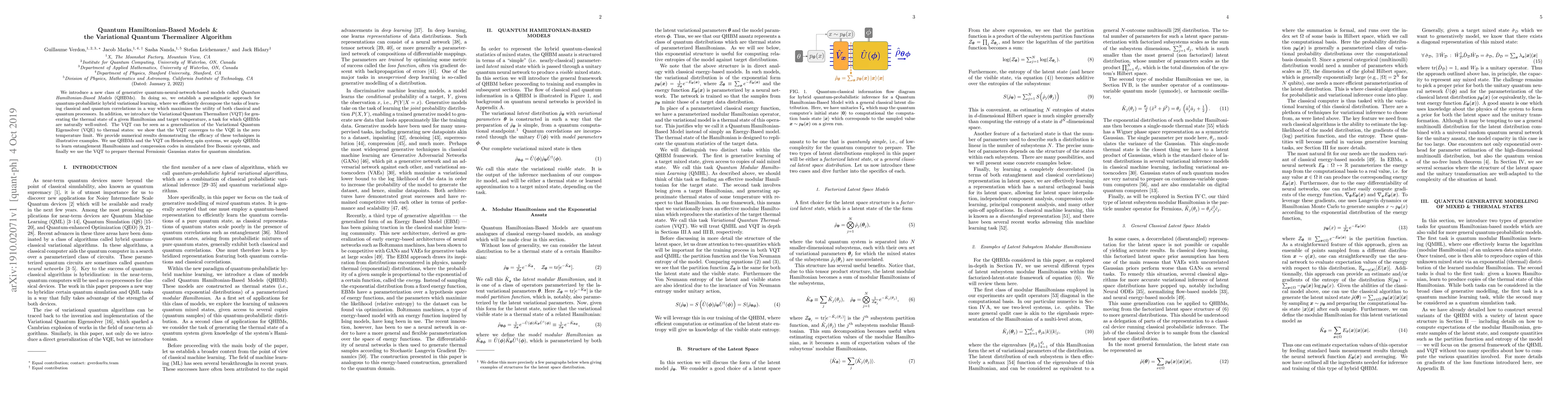 We introduce a new class of generative quantum-neural-network-based models called Quantum Hamiltonian-Based Models (QHBMs). In doing so, we establish a paradigmatic approach for quantum-probabilistic hybrid variational learning, where we efficiently decompose the tasks of learning classical and quantum correlations in a way which maximizes the utility of both classical and quantum processors. In addition, we introduce the Variational Quantum Thermalizer (VQT) for generating the thermal state of a given Hamiltonian and target temperature, a task for which QHBMs are naturally well-suited. The VQT can be seen as a generalization of the Variational Quantum Eigensolver (VQE) to thermal states: we show that the VQT converges to the VQE in the zero temperature limit. We provide numerical results demonstrating the efficacy of these techniques in illustrative examples. We use QHBMs and the VQT on Heisenberg spin systems, we apply QHBMs to learn entanglement Hamiltonians and compression codes in simulated free Bosonic systems, and finally we use the VQT to prepare thermal Fermionic Gaussian states for quantum simulation.