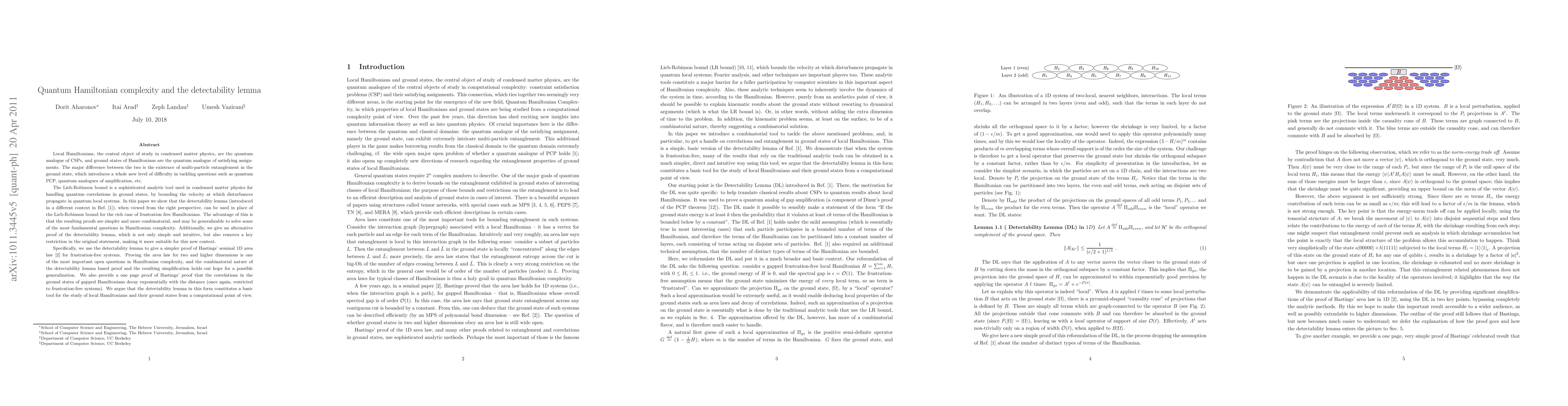 This paper introduces a generalized version of the detectability lemma to tackle quantum Hamiltonian complexity, providing a simplified proof for Hastings' 1D area law and the decay of correlations in gapped local Hamiltonian systems. The authors argue that this lemma can replace the Lieb-Robinson bound in various contexts, positioning it as a fundamental tool for studying local Hamiltonians and their ground states.