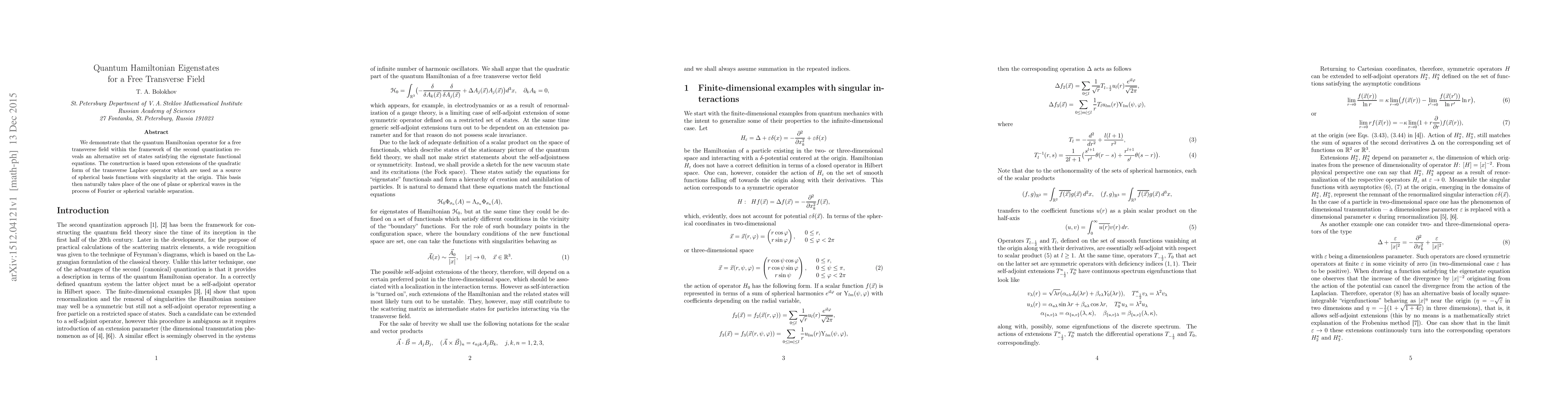 We demonstrate that quantum Hamiltonian operator for a free transverse field within the framework of the second quantization reveals an alternative set of states satisfying the eigenstate functional equations. The construction is based upon extensions of the quadratic form of the transverse Laplace operator which are used as a source of spherical basis functions with singularity at the origin. This basis then naturally takes place of the one of plane or spherical waves in the process of Fourrier or spherical variable separation.