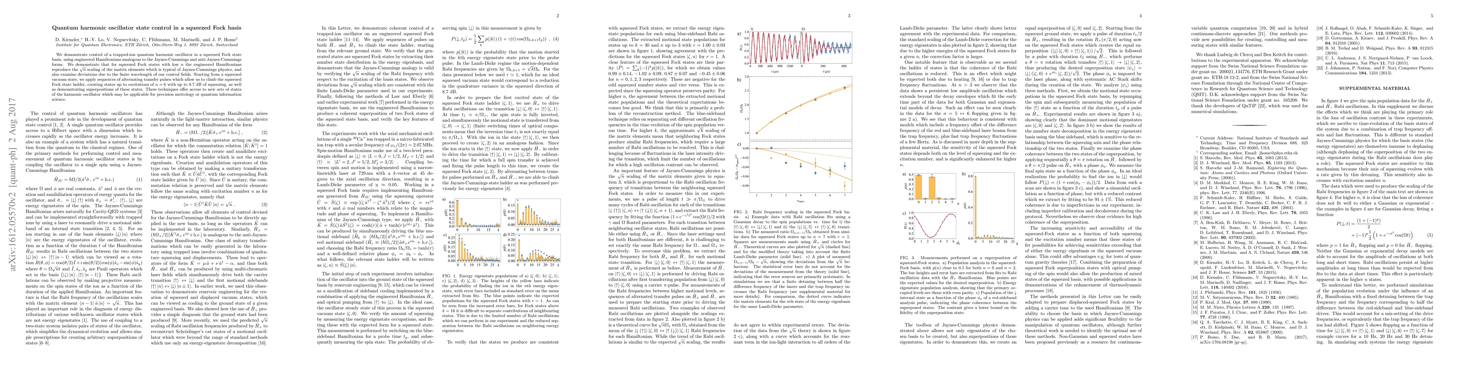 This paper demonstrates control of a trapped-ion quantum harmonic oscillator in squeezed Fock states using engineered Hamiltonians, achieving up to 8.7 dB of squeezing for states up to $n = 6$. The study explores the $\sqrt{n}$ scaling typical of Jaynes-Cummings physics and examines deviations due to finite control field wavelengths.