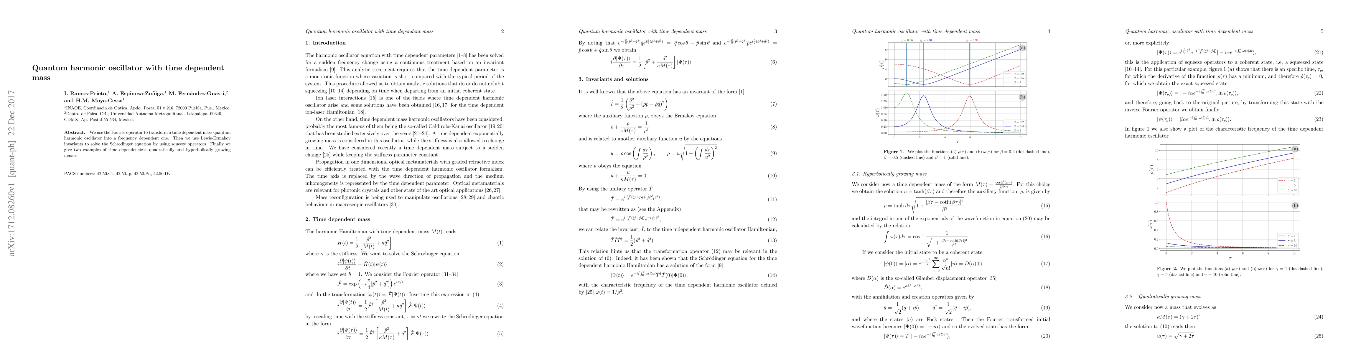 This paper transforms a quantum harmonic oscillator with a time-dependent mass into a frequency-dependent one using Fourier operators and solves the Schrödinger equation via Lewis-Ermakov invariants and squeeze operators. It provides examples with quadratically and hyperbolically growing masses.