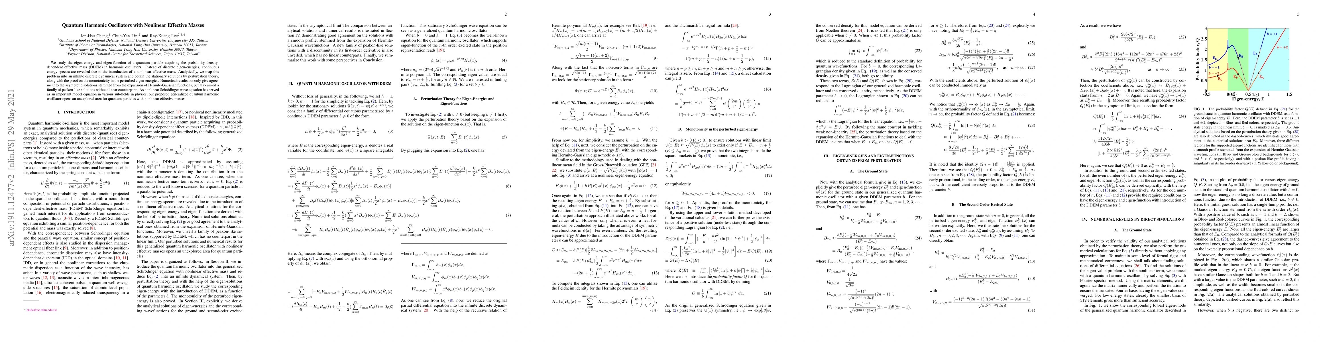 We study the eigen-energy and eigen-function of a quantum particle acquiring the probability density-dependent effective mass (DDEM) in harmonic oscillators. Instead of discrete eigen-energies, continuous energy spectra are revealed due to the introduction of a nonlinear effective mass. Analytically, we map this problem into an infinite discrete dynamical system and obtain the stationary solutions by perturbation theory, along with the proof on the monotonicity in the perturbed eigen-energies. Numerical results not only give agreement to the asymptotic solutions stemmed from the expansion of Hermite-Gaussian functions, but also unveil a family of peakon-like solutions without linear counterparts. As nonlinear Schr{\"o}dinger wave equation has served as an important model equation in various sub-fields in physics, our proposed generalized quantum harmonic oscillator opens an unexplored area for quantum particles with nonlinear effective masses.
