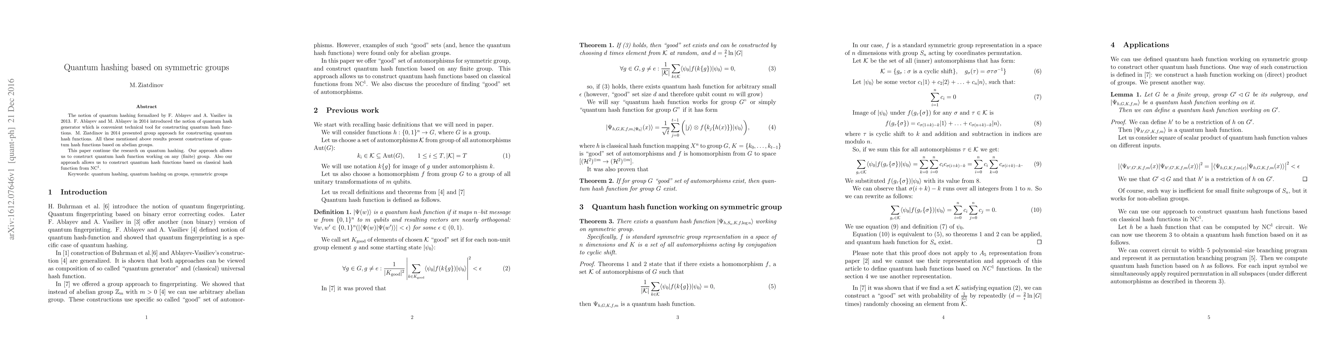 This paper extends the research on quantum hashing by constructing quantum hash functions based on any finite group, rather than just abelian groups, and introduces a method to build quantum hash functions from classical hash functions in $NC^1$.