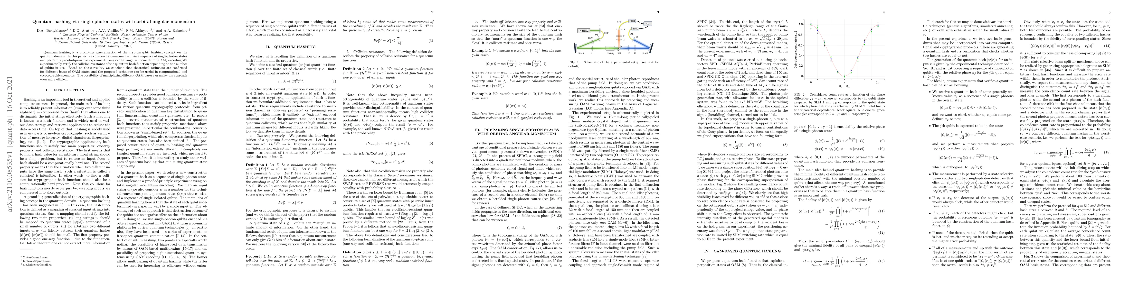 This paper proposes a quantum hash function using single-photon states with orbital angular momentum (OAM) encoding, demonstrating its collision resistance through an experimental proof-of-principle. The results confirm theoretical estimates, suggesting its potential for enhancing computational and cryptographic applications.