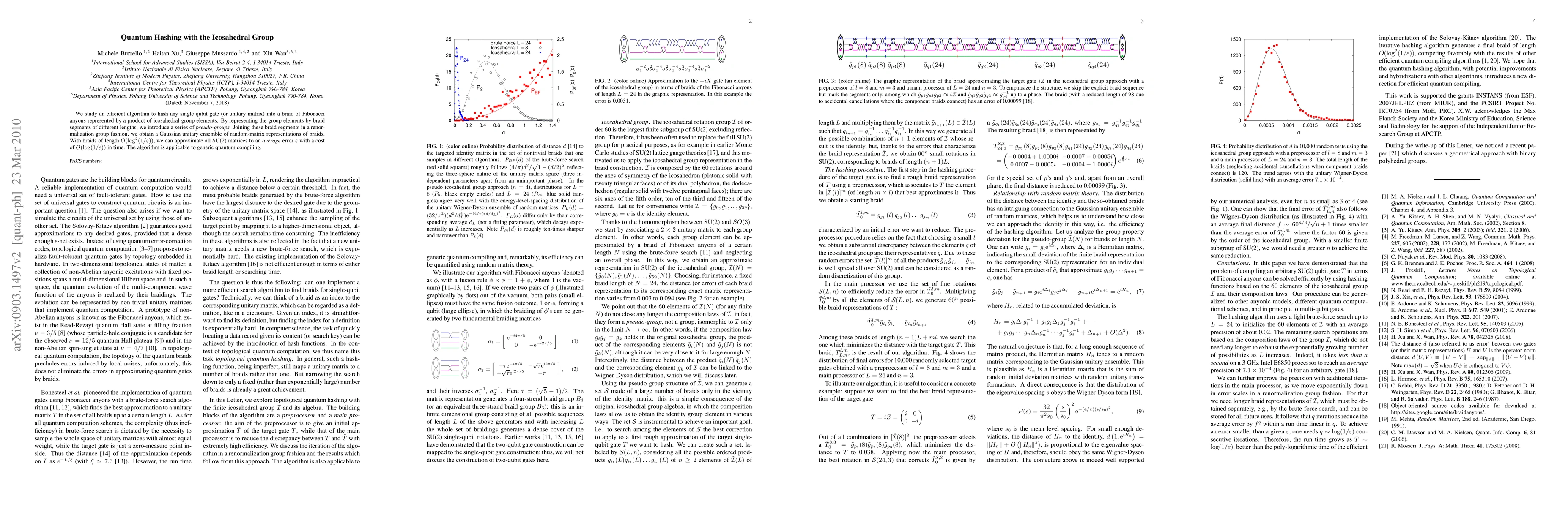 Researchers developed an algorithm to hash single qubit gates into Fibonacci anyons represented by icosahedral group elements, enabling efficient approximation of SU(2) matrices with low error.
