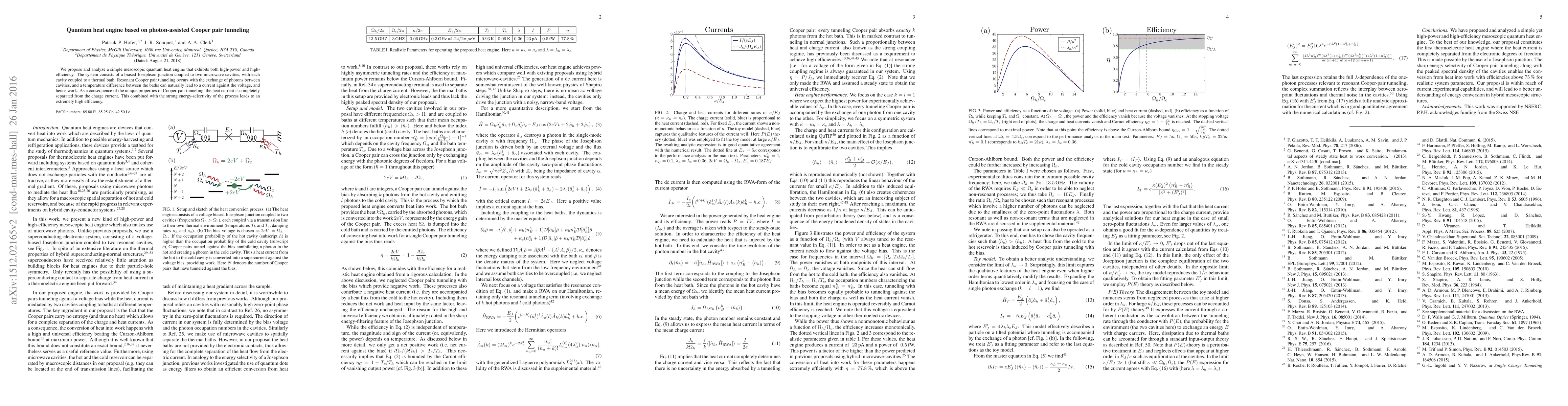 This paper proposes a mesoscopic quantum heat engine based on photon-assisted Cooper pair tunneling through a biased Josephson junction, achieving high power and efficiency by separating heat and charge currents. The system leverages resonant tunneling and photon exchange between coupled microwave cavities to generate work from a temperature difference.
