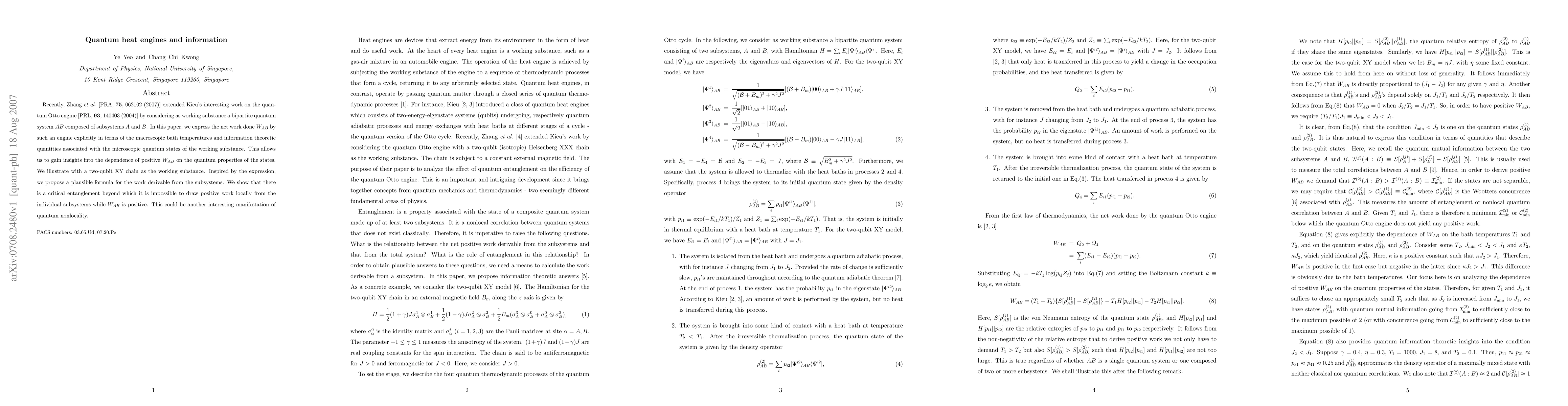 Recently, Zhang {\em et al.} [PRA, {\bf 75}, 062102 (2007)] extended Kieu's interesting work on the quantum Otto engine [PRL, {\bf 93}, 140403 (2004)] by considering as working substance a bipartite quantum system $AB$ composed of subsystems $A$ and $B$. In this paper, we express the net work done $W_{AB}$ by such an engine explicitly in terms of the macroscopic bath temperatures and information theoretic quantities associated with the microscopic quantum states of the working substance. This allows us to gain insights into the dependence of positive $W_{AB}$ on the quantum properties of the states. We illustrate with a two-qubit XY chain as the working substance. Inspired by the expression, we propose a plausible formula for the work derivable from the subsystems. We show that there is a critical entanglement beyond which it is impossible to draw positive work locally from the individual subsystems while $W_{AB}$ is positive. This could be another interesting manifestation of quantum nonlocality.