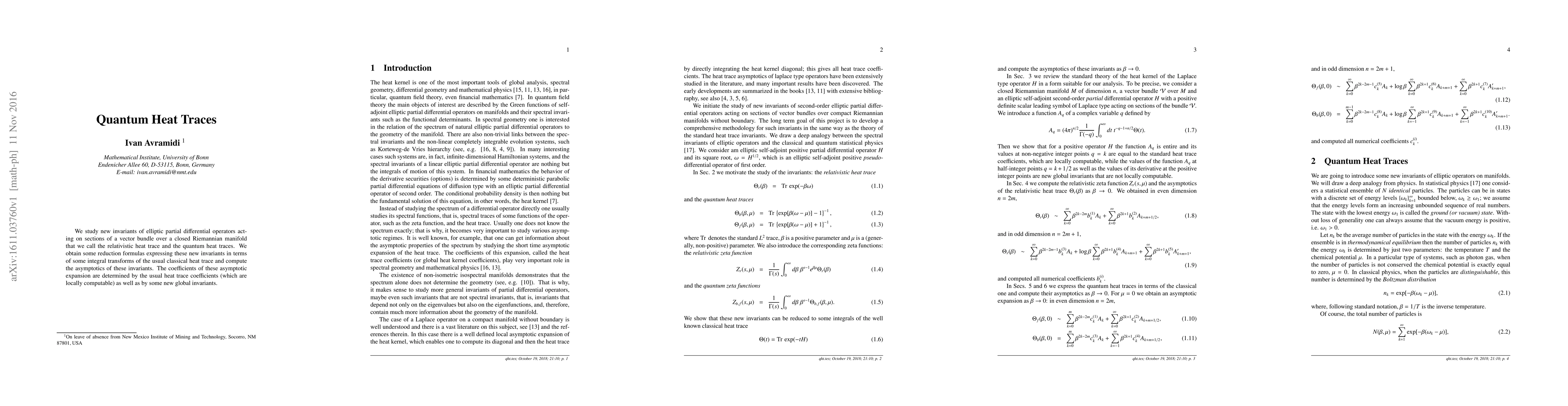 We study new invariants of elliptic partial differential operators acting on sections of a vector bundle over a closed Riemannian manifold that we call the relativistic heat trace and the quantum heat traces. We obtain some reduction formulas expressing these new invariants in terms of some integral transforms of the usual classical heat trace and compute the asymptotics of these invariants. The coefficients of these asymptotic expansion are determined by the usual heat trace coefficients (which are locally computable) as well as by some new global invariants.