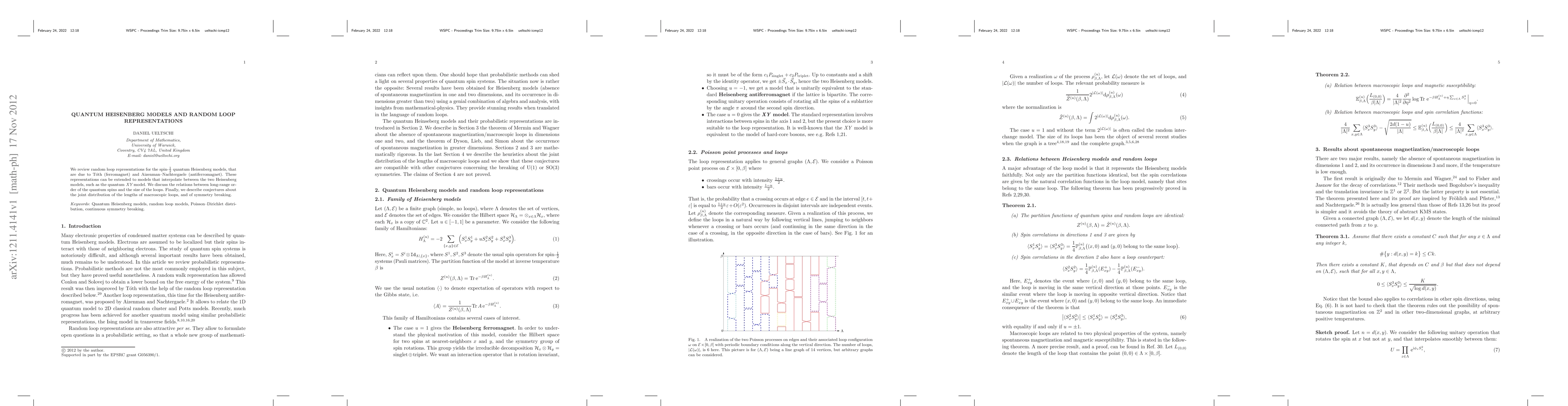 This paper reviews random loop representations for quantum Heisenberg models, exploring their implications for spin order and symmetry breaking, and making conjectures about macroscopic loop lengths.
