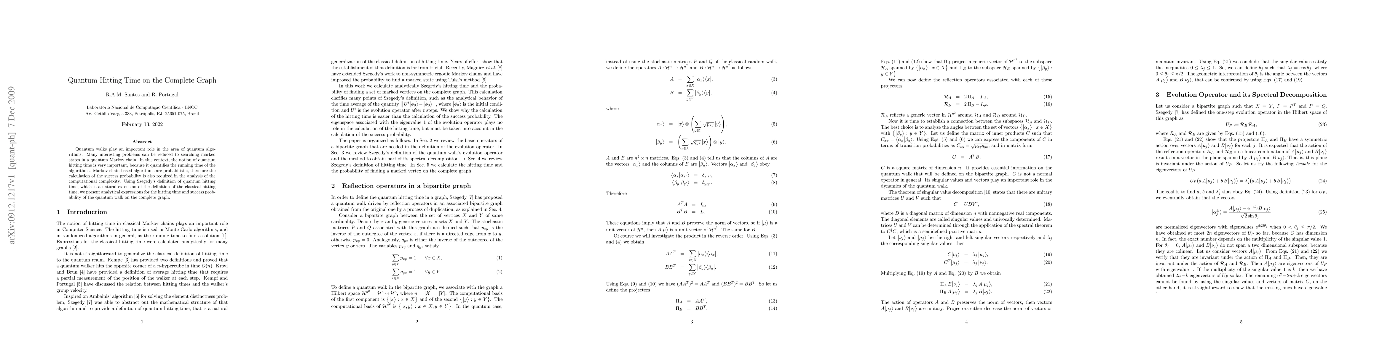 This paper analyzes the quantum hitting time on the complete graph, providing analytical expressions for hitting time and success probability in quantum Markov chain-based algorithms.
