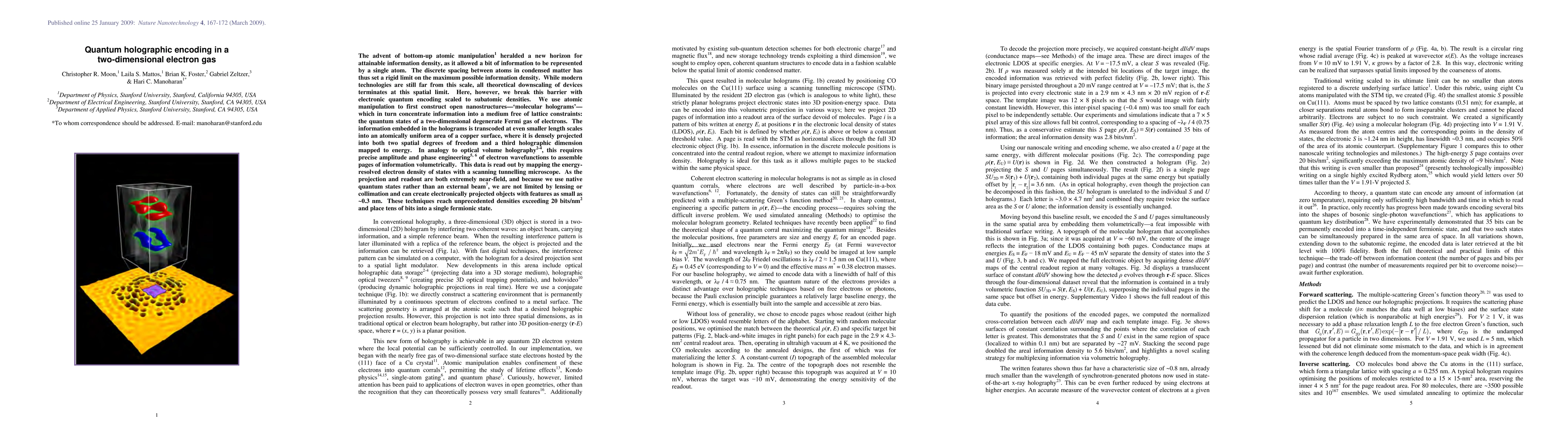 The advent of bottom-up atomic manipulation heralded a new horizon for attainable information density, as it allowed a bit of information to be represented by a single atom. The discrete spacing between atoms in condensed matter has thus set a rigid limit on the maximum possible information density. While modern technologies are still far from this scale, all theoretical downscaling of devices terminates at this spatial limit. Here, however, we break this barrier with electronic quantum encoding scaled to subatomic densities. We use atomic manipulation to first construct open nanostructures--"molecular holograms"--which in turn concentrate information into a medium free of lattice constraints: the quantum states of a two-dimensional degenerate Fermi gas of electrons. The information embedded in the holograms is transcoded at even smaller length scales into an atomically uniform area of a copper surface, where it is densely projected into both two spatial degrees of freedom and a third holographic dimension mapped to energy. In analogy to optical volume holography, this requires precise amplitude and phase engineering of electron wavefunctions to assemble pages of information volumetrically. This data is read out by mapping the energy-resolved electron density of states with a scanning tunnelling microscope. As the projection and readout are both extremely near-field, and because we use native quantum states rather than an external beam, we are not limited by lensing or collimation and can create electronically projected objects with features as small as ~0.3 nm. These techniques reach unprecedented densities exceeding 20 bits/nm2 and place tens of bits into a single fermionic state.